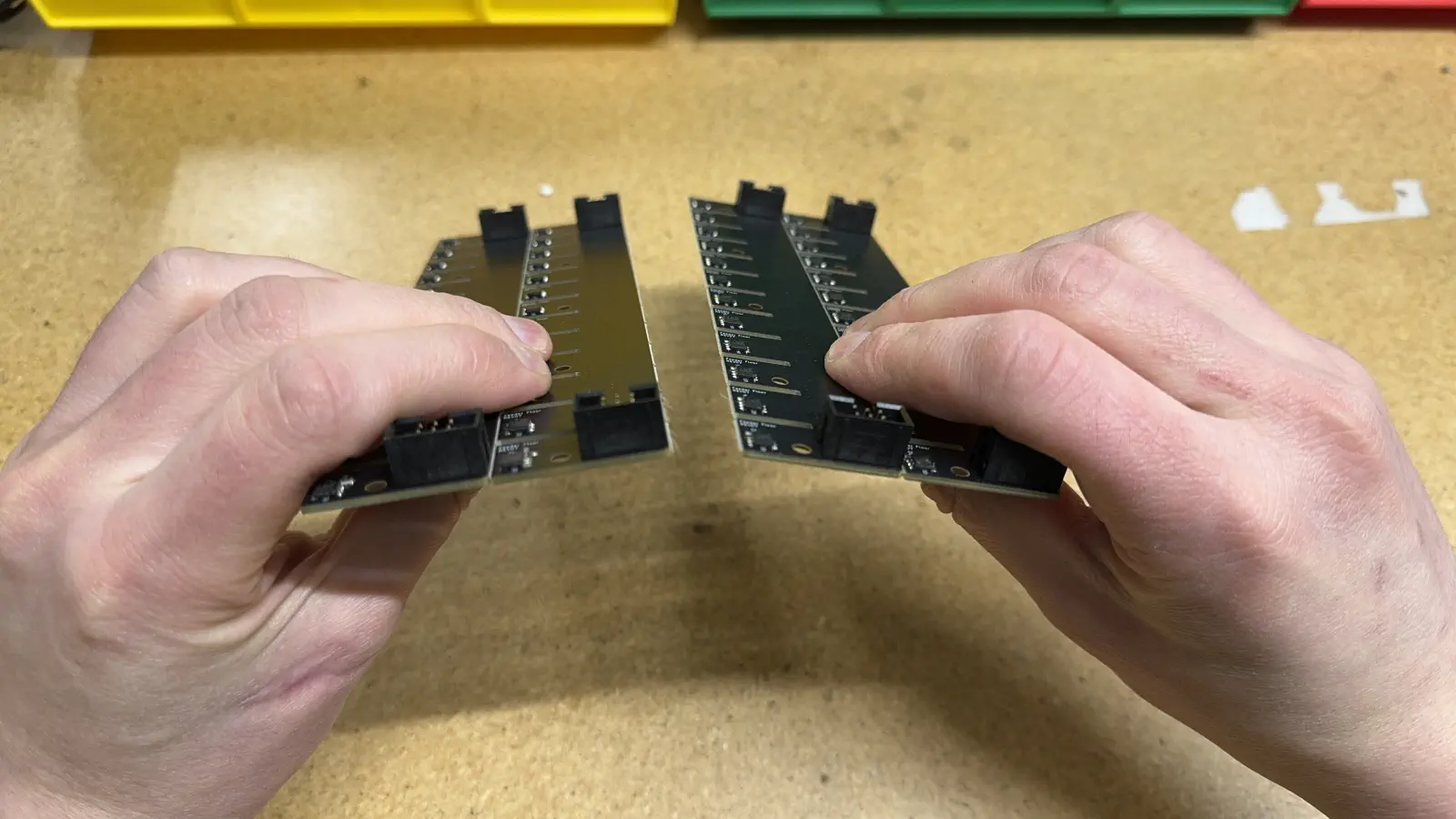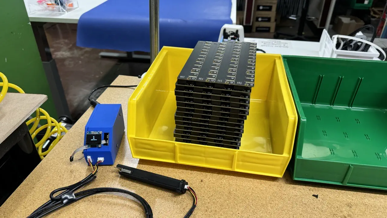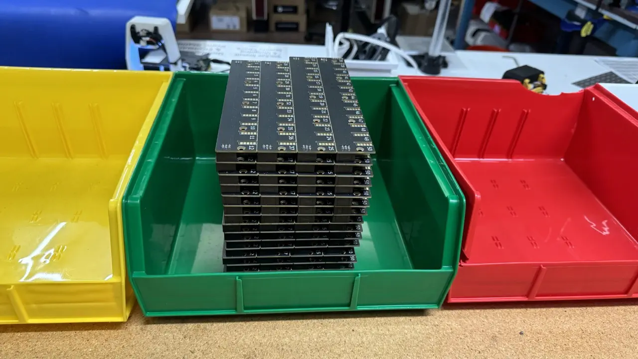 Place all QC passing feeder-blade-panel (PCBA) units into the green QC bin