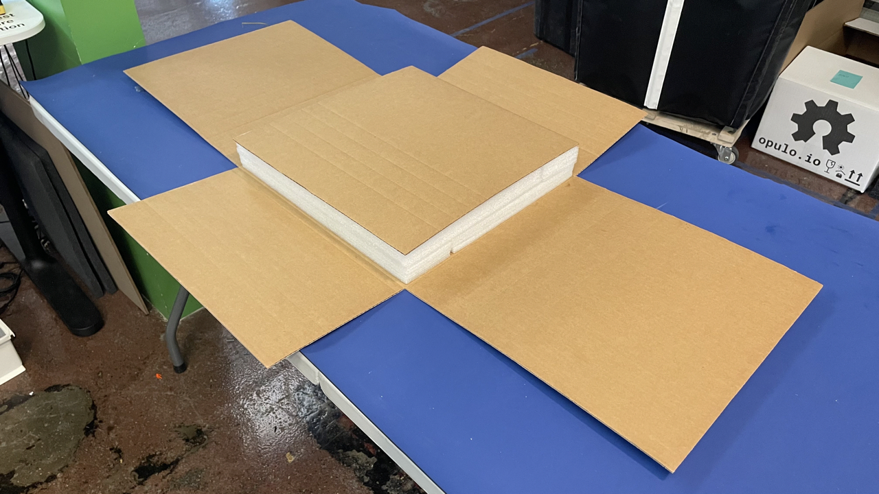 Place a 15" x 14.5" cardboard pad on top of the stacked foam trays