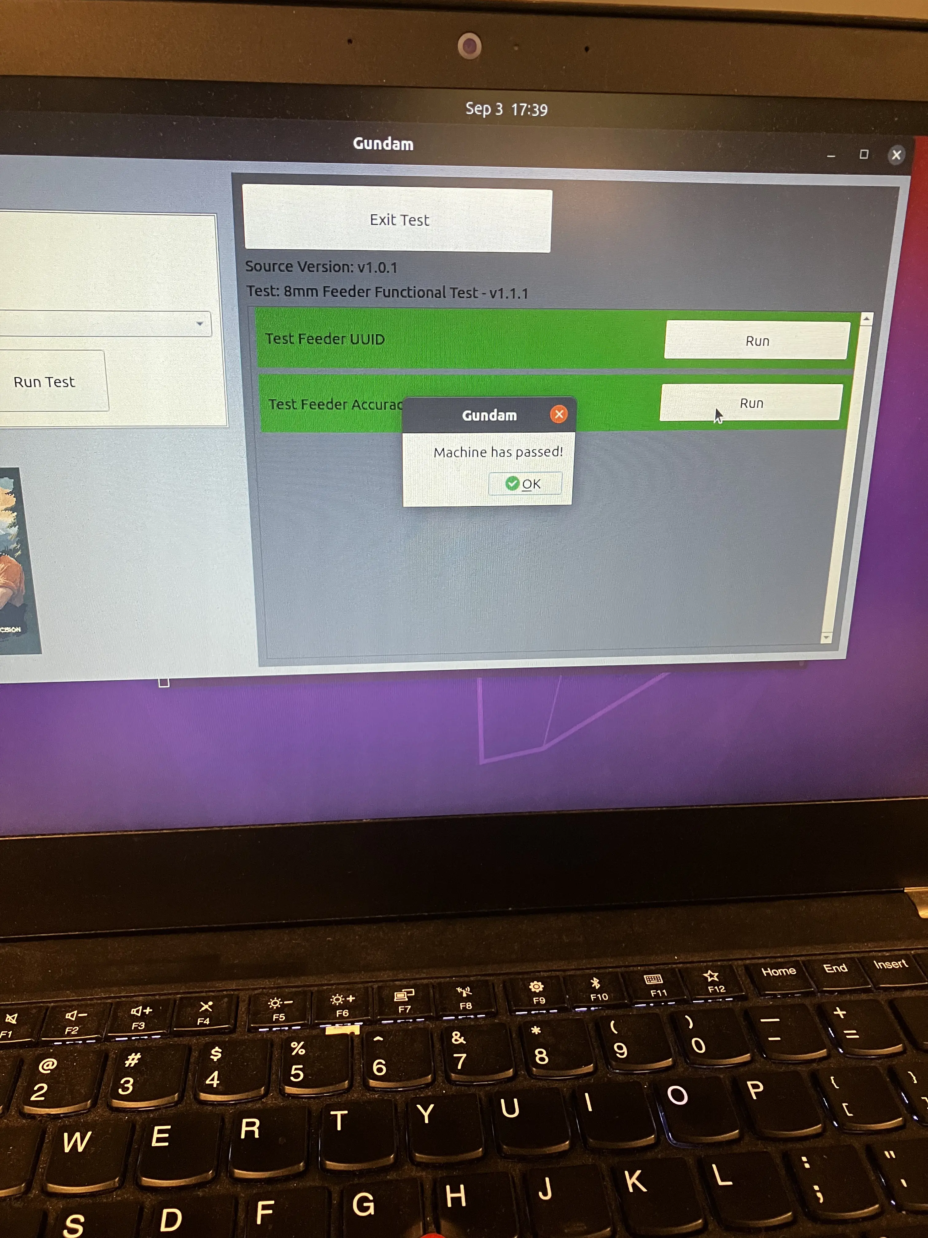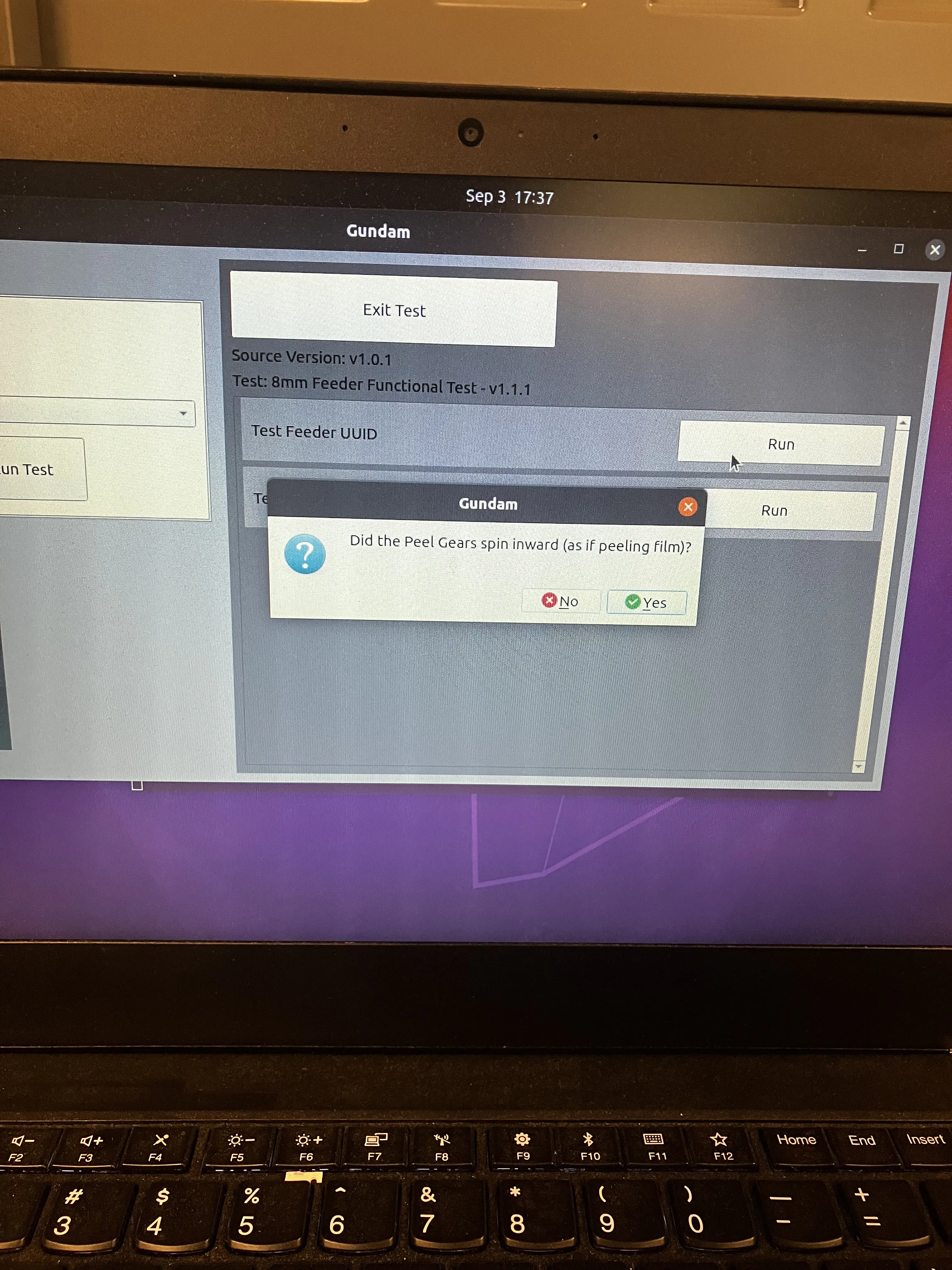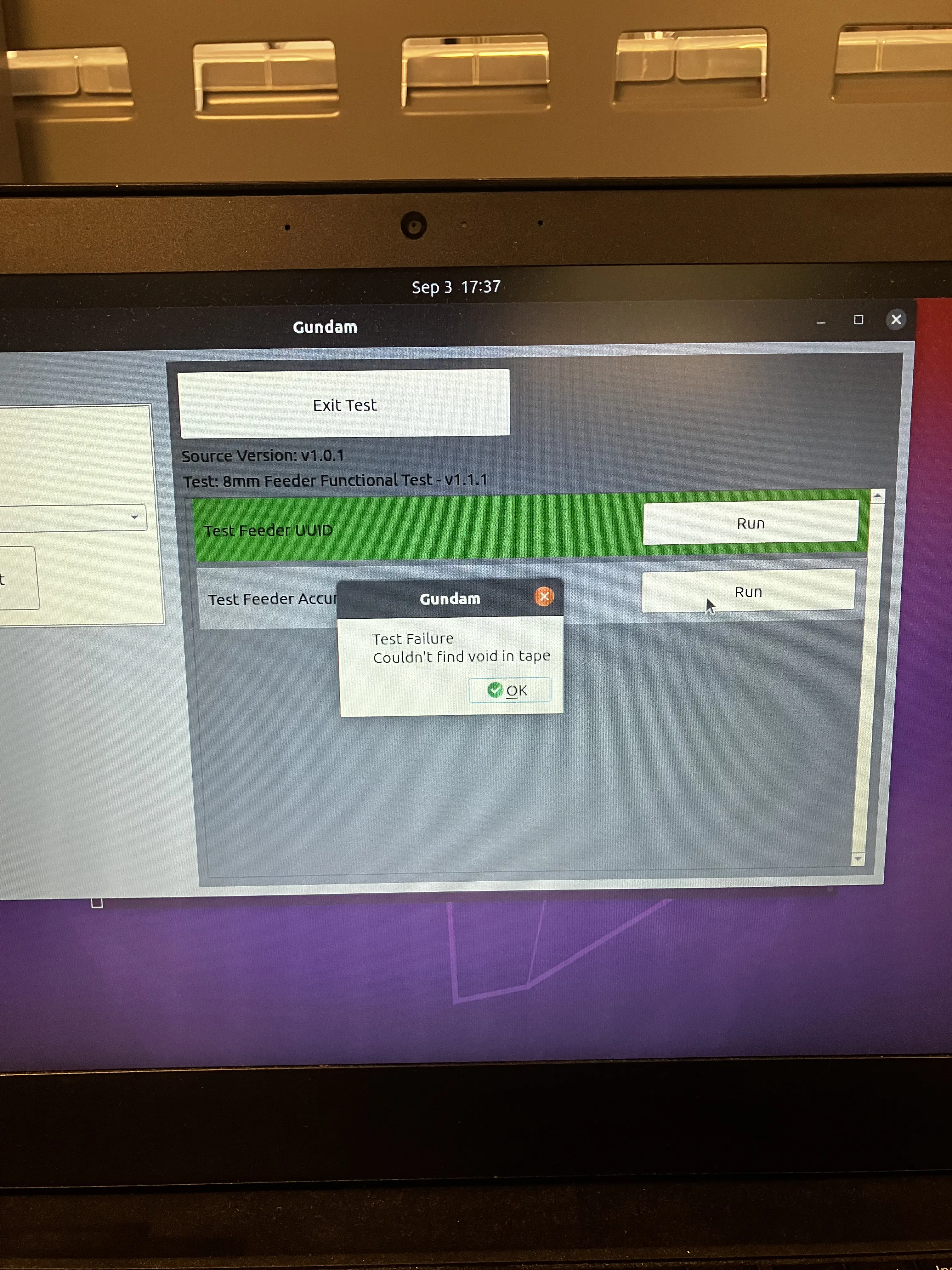 With the 8mm feeders, sometimes the Gundam test will stop and state that there is an "absurd y variance" or "could not find void in tape". Either unload and load the feeder to try again, or try using the second Gundam station.