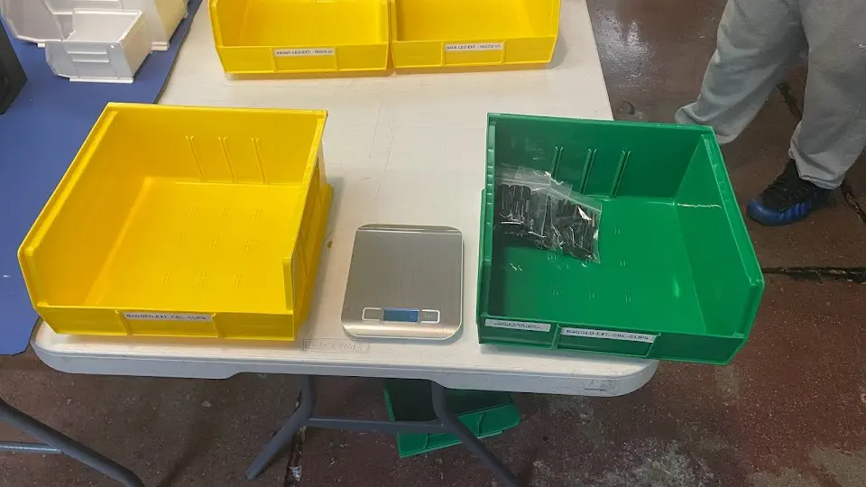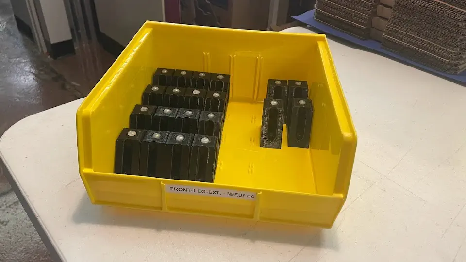 front-leg-extensioninto a yellow NEEDS QC bin while it awaits inspection