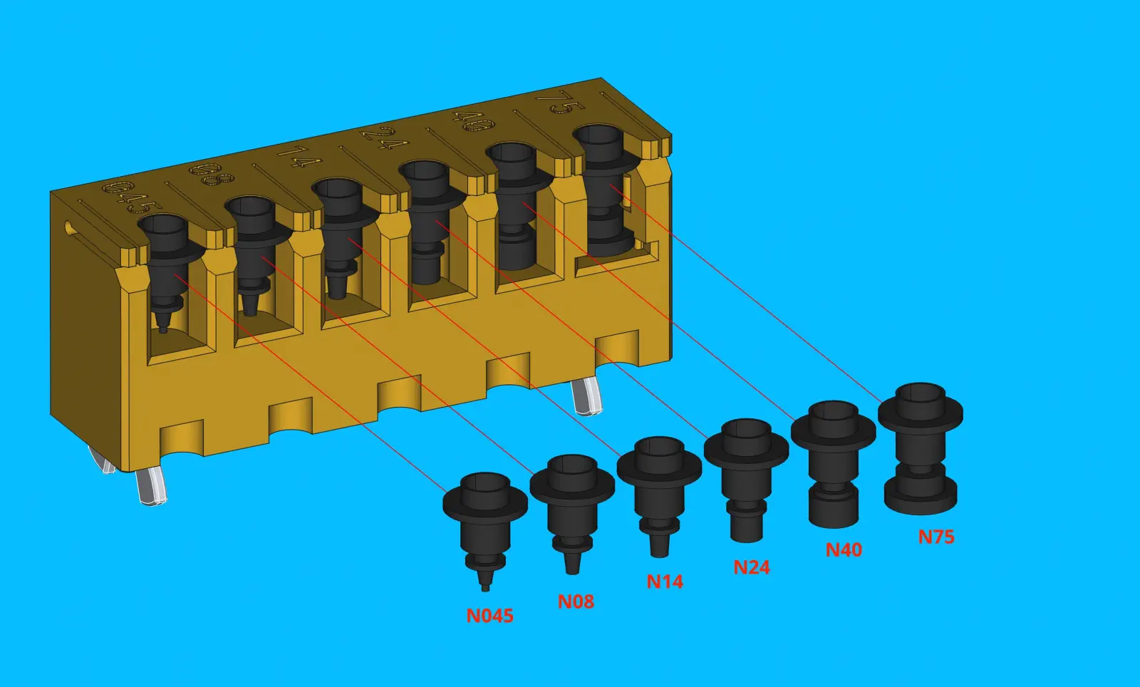 nozzle-rack, ensuring that each nozzle can pop in and out relatively easily
