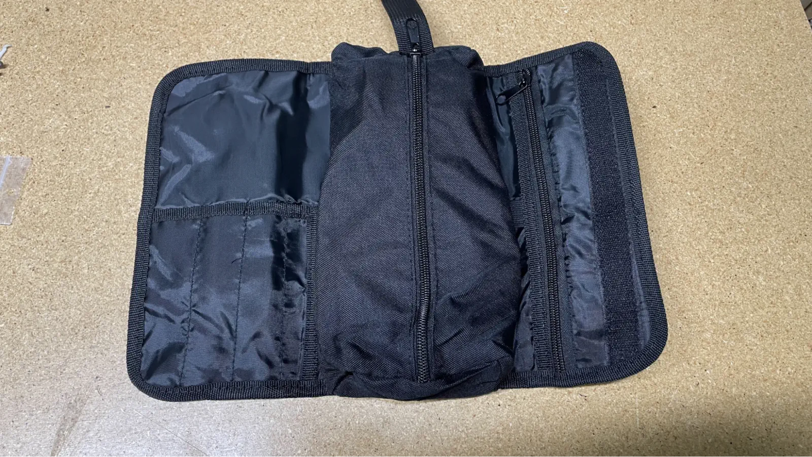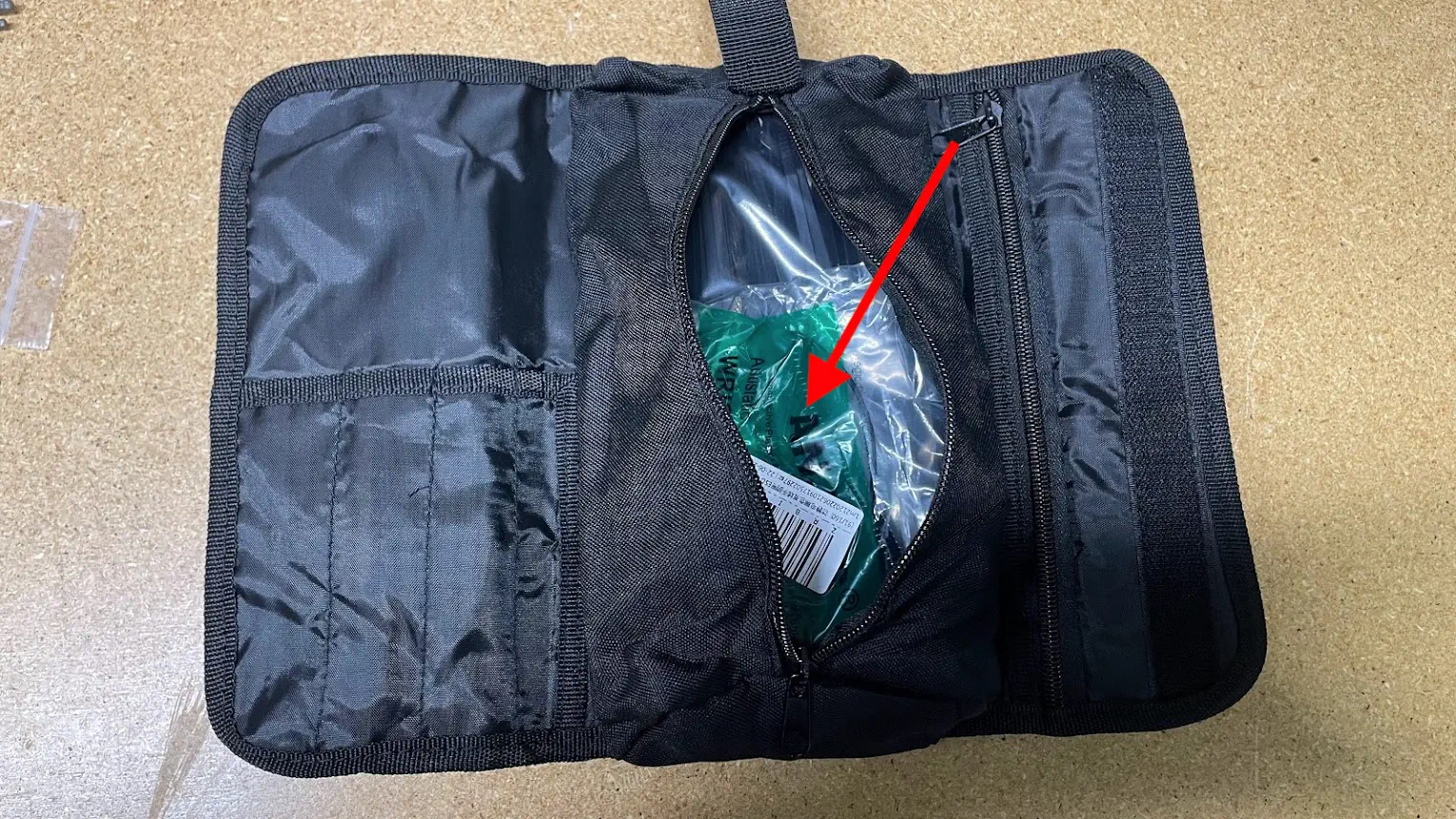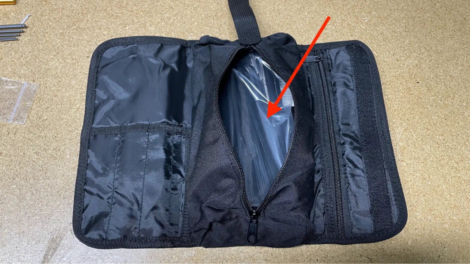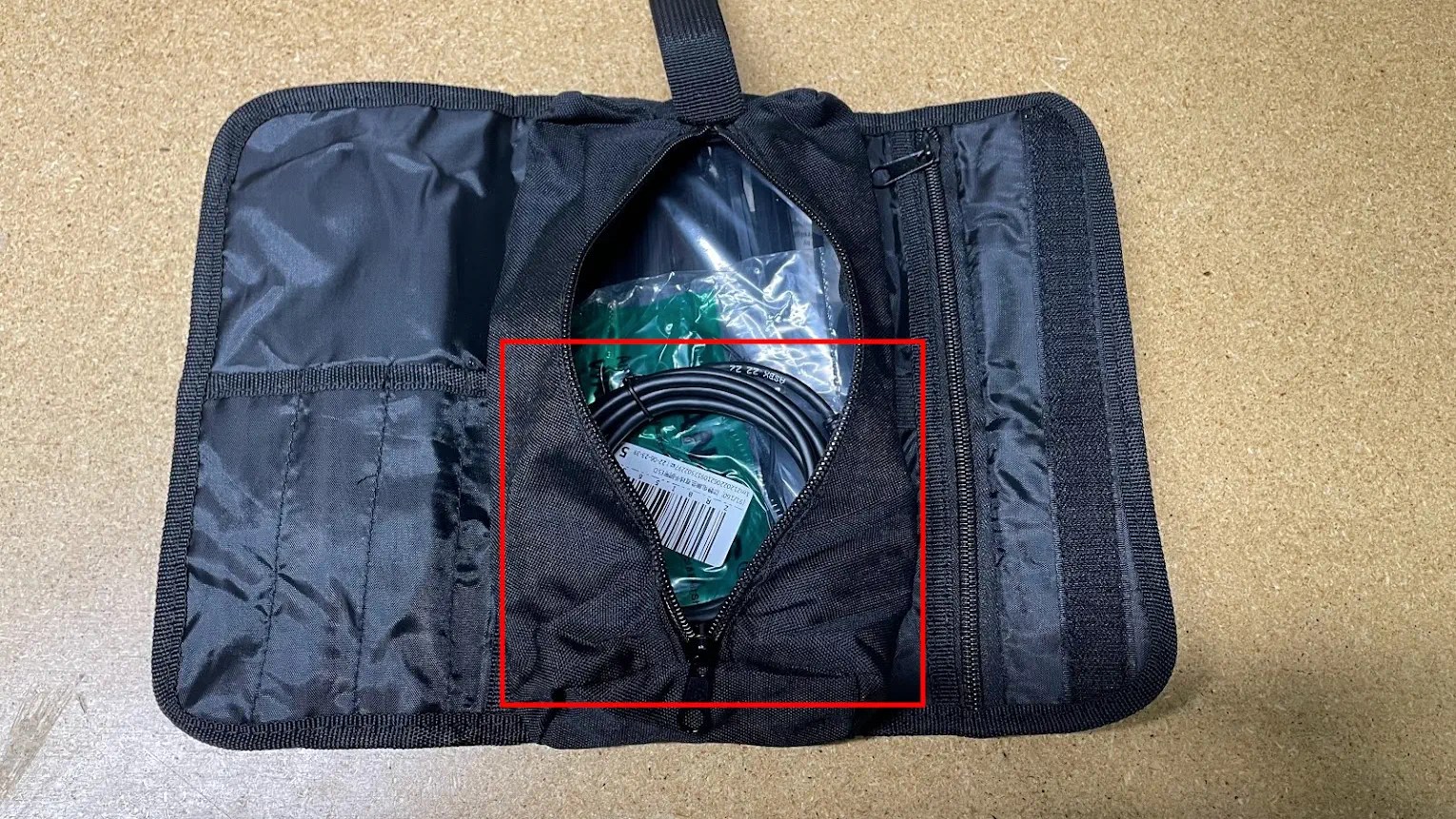 USB-A to USB-B cableaboveESD wrist strap, towards the bottom of pouch