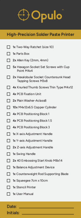 Each shipment should include a High-Precision Solder Paste Printer Checklist to ensure that all parts from the Parts List above are present and meet our standards for quality.