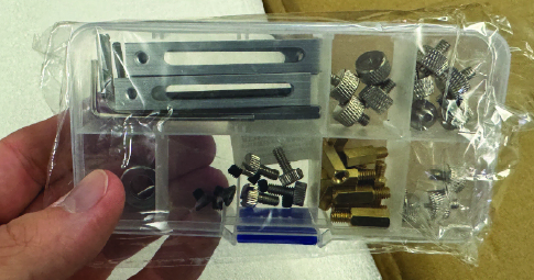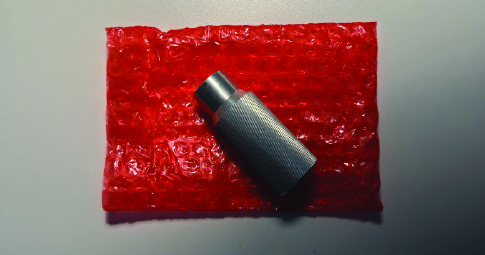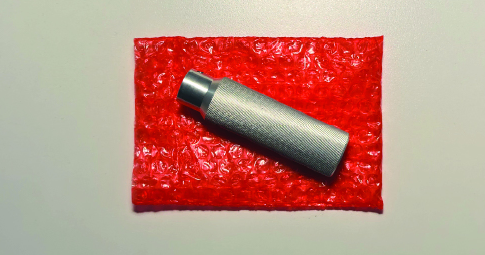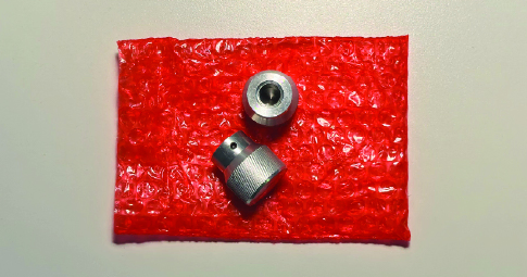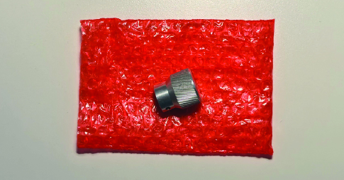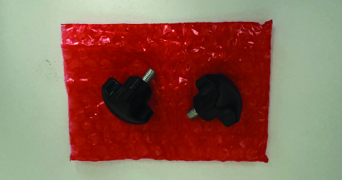 2. Return the 2x 40 Embossing Start Knob M8x14 back to the red bubble wrap bag and place on the inside of the shrink wrap that is wrapped around the Stencil Printer.