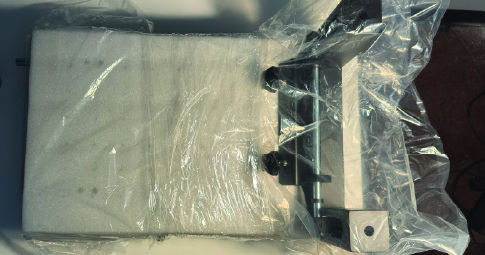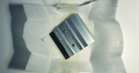 1. Return the Squeegee 7cm x 10cm into the foam wrap and place on the inside of the shrink wrap that is wrapped around the Stencil Printer.