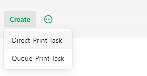 This page is where the print files live. Select the file you'd like to print, click the "Create" button on the far right to create a print job. From the drop-down menu, select Direct-Print Task.