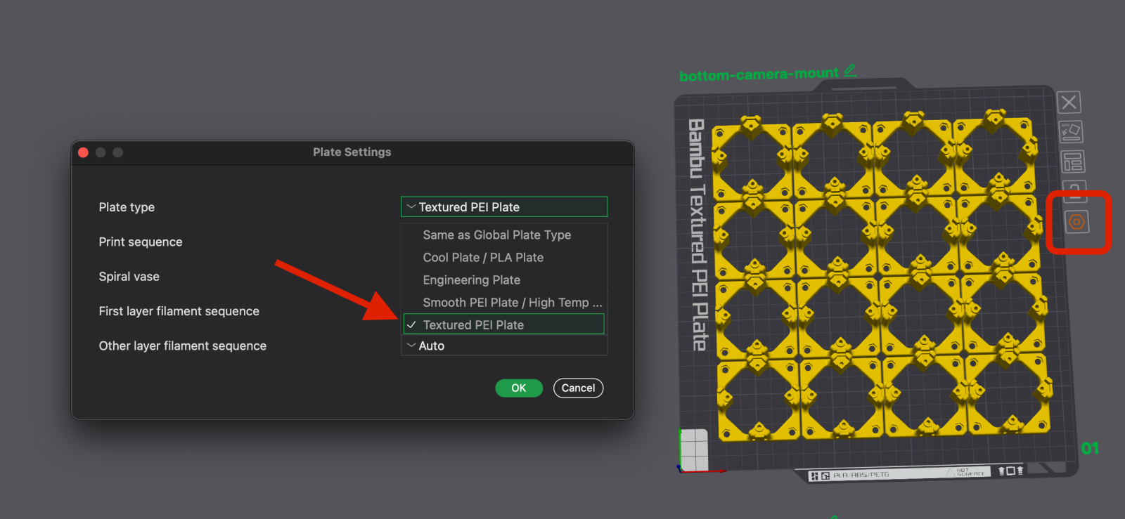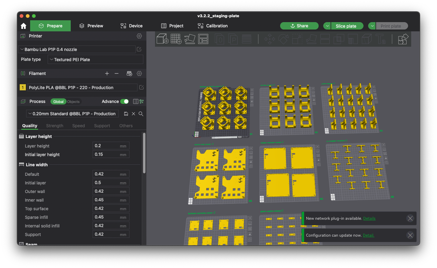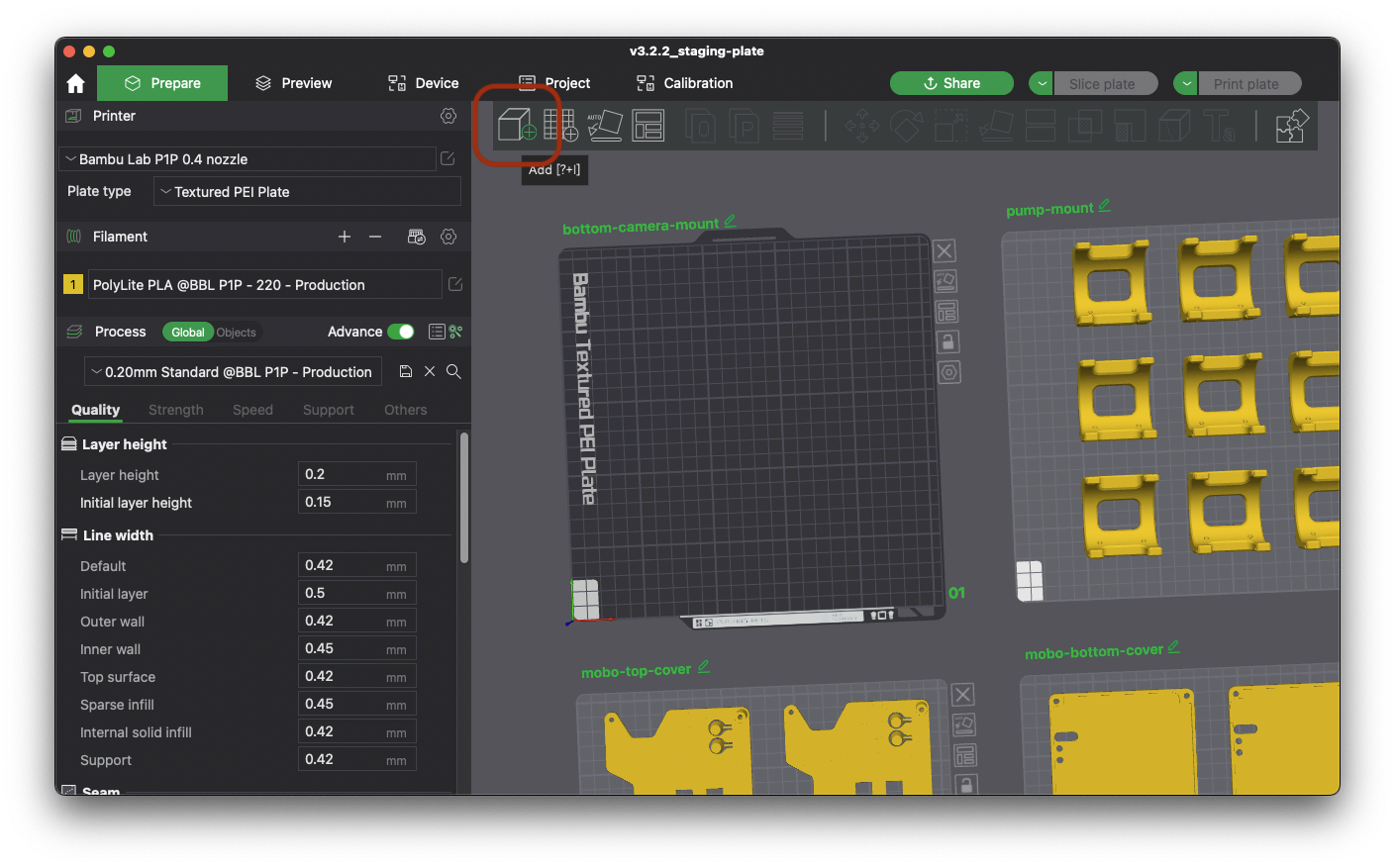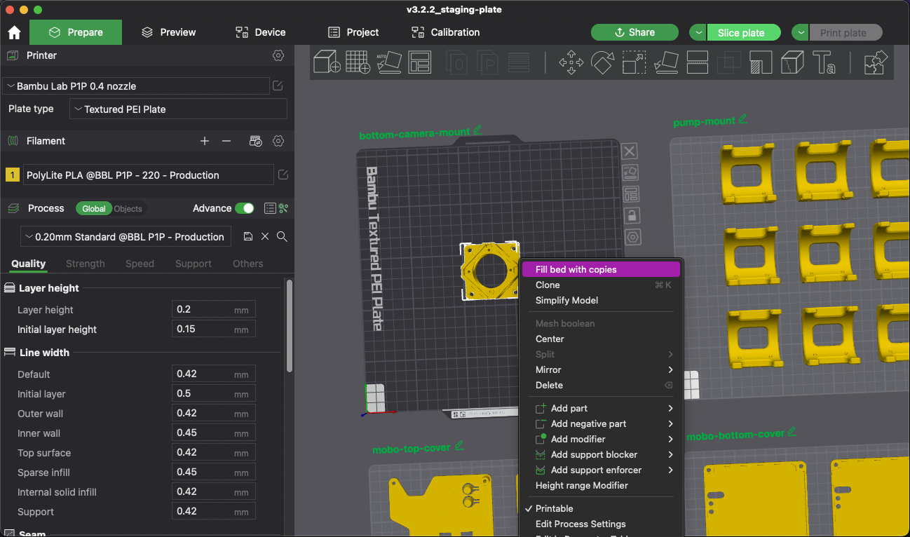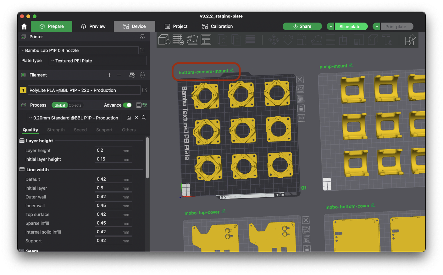 MFG - STANDARD - 0.2mm P1Pfor almost all prints. The few exceptions are that the feeder frame needs to useMFG - FEEDER - 0.2mm P1Pand the worm-gear needs to useMFG - DETAIL - 0.08mm P1P. - Be sure you're slicing with the correct Plate Type. Reference the Print Farm Kanban Cards for the correct plate type for each print.