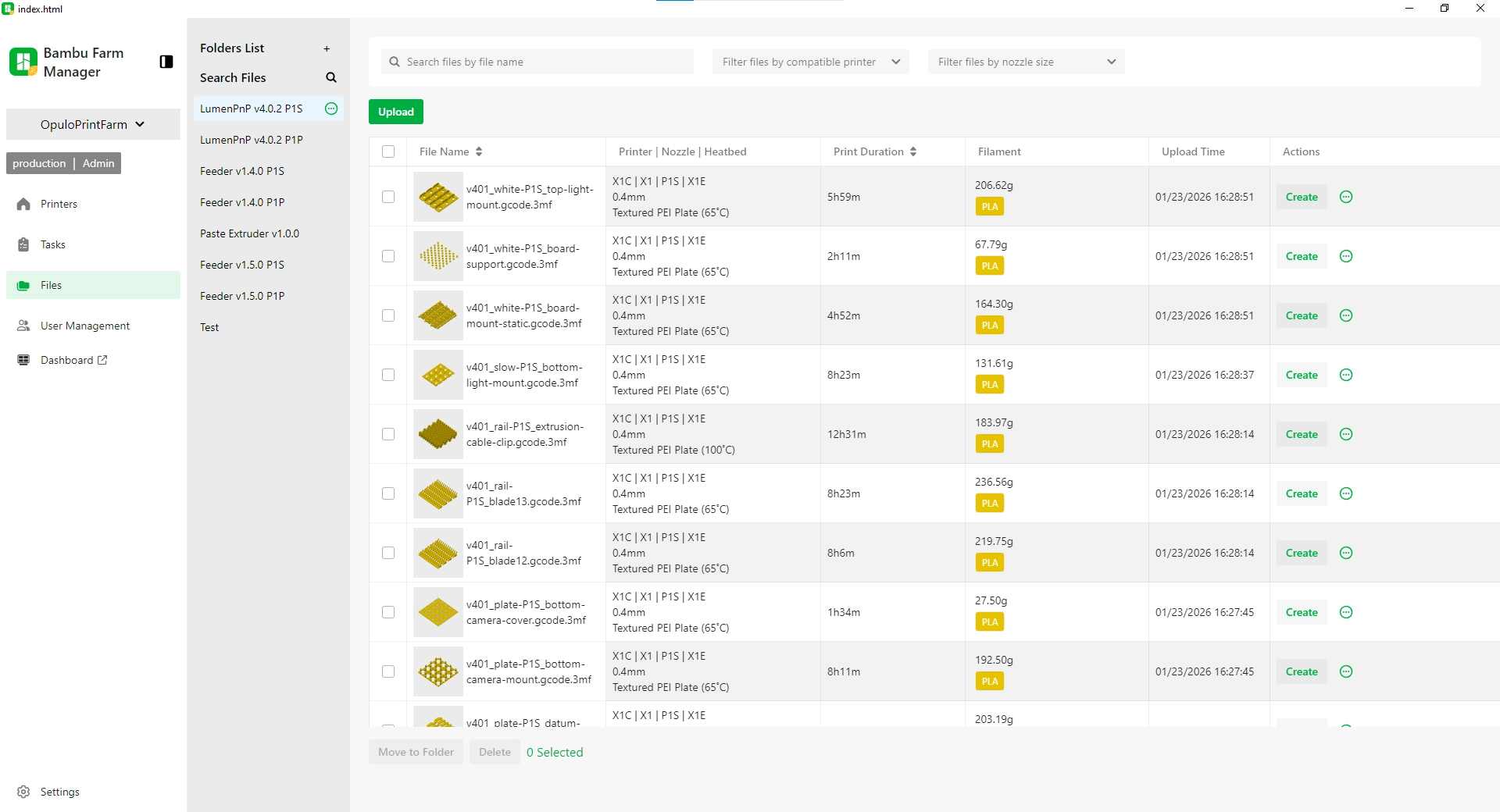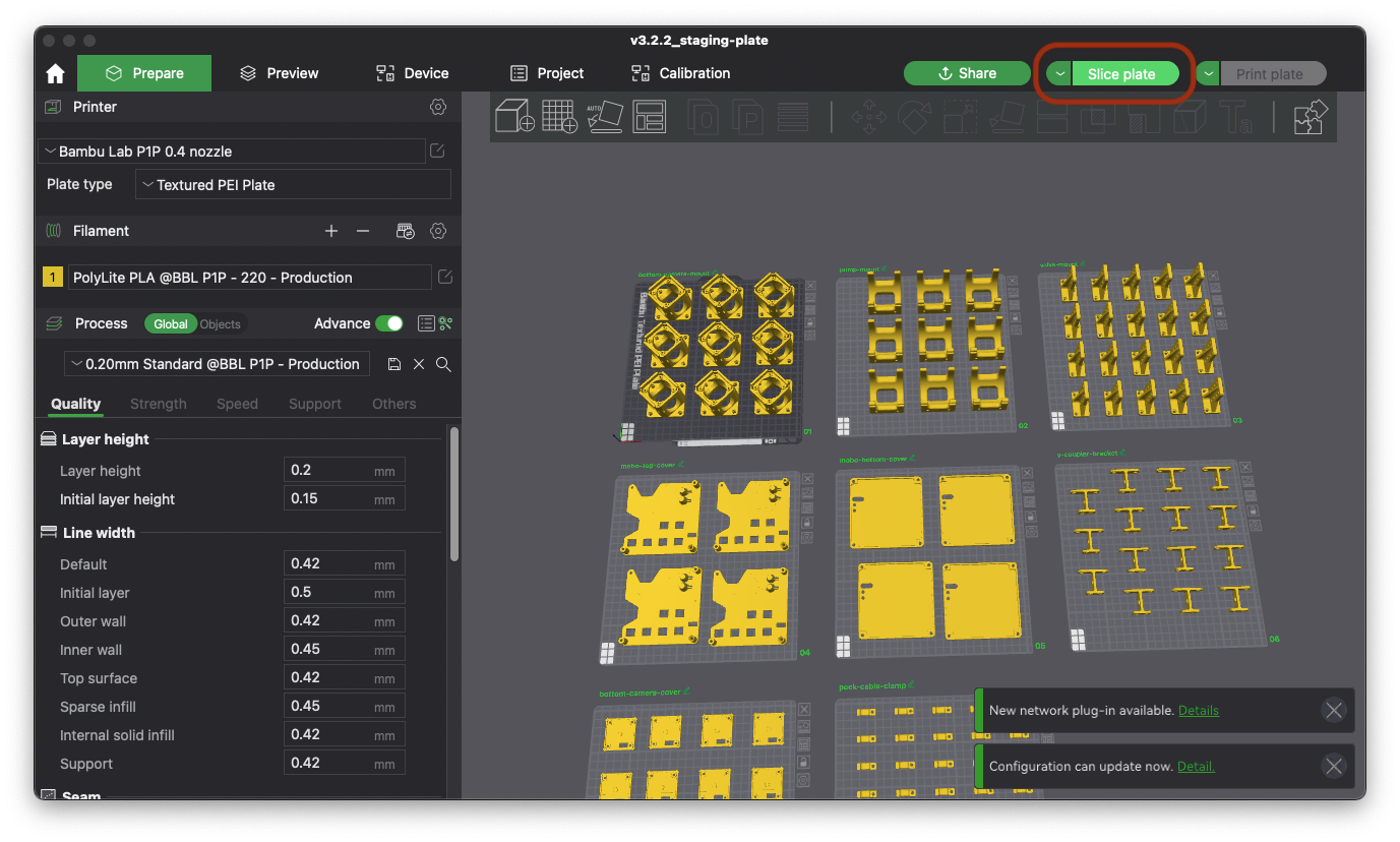 With your 3MFs up to date, we'll slice them and send them to all the printers on the farm.