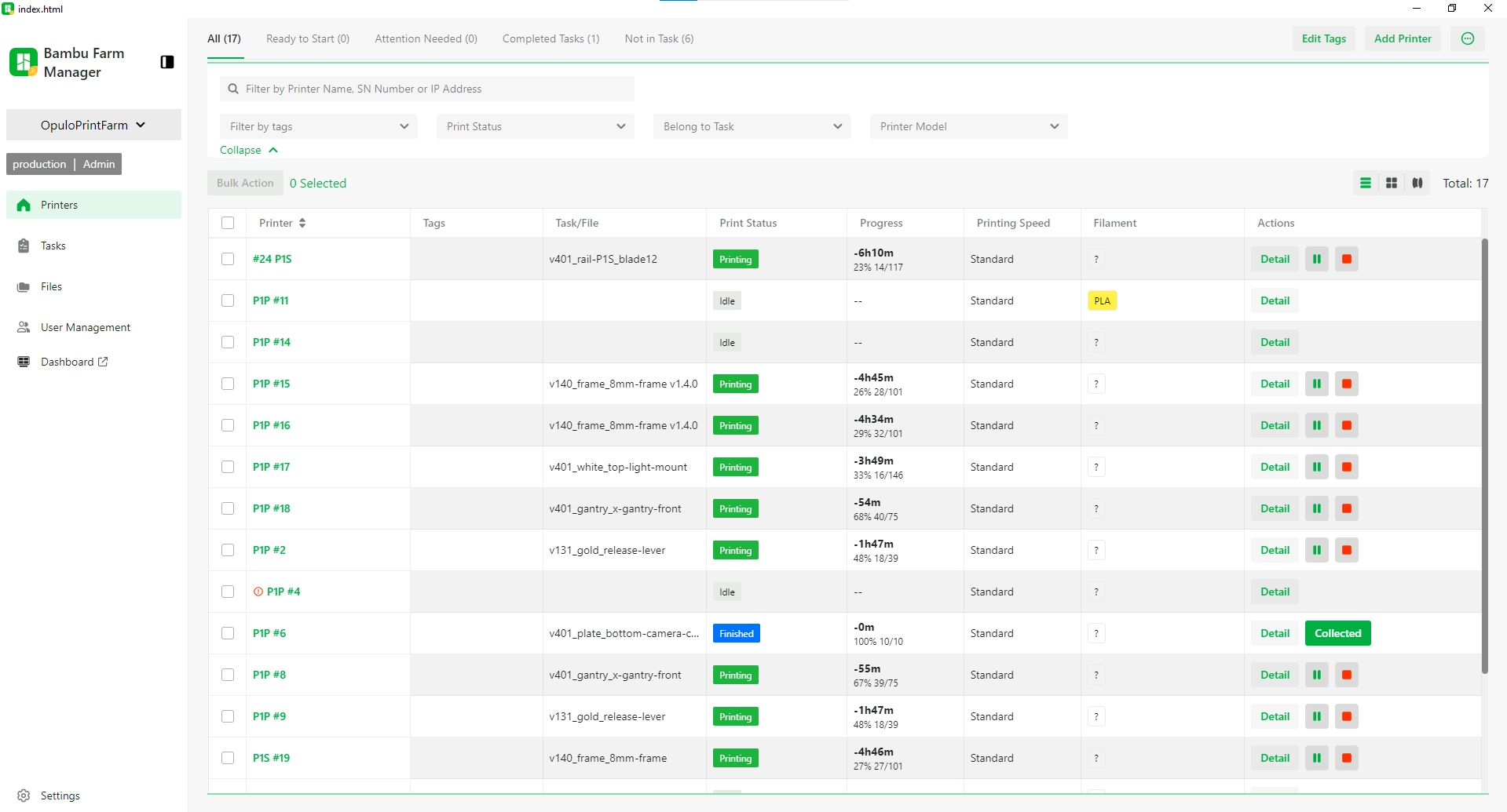 To manage all of our printers at once, we use Bambu Farm Manager running on a standalone Windows PC near the print farm. This allows us to instantly send prints to multiple printers, manage files, and more.
