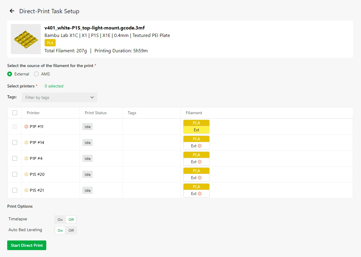 Select the printer you would like to use, make sure Timelapse is set to "Off" and Auto Bed Leveling is set to "On". Then click "Start Direct Print".
