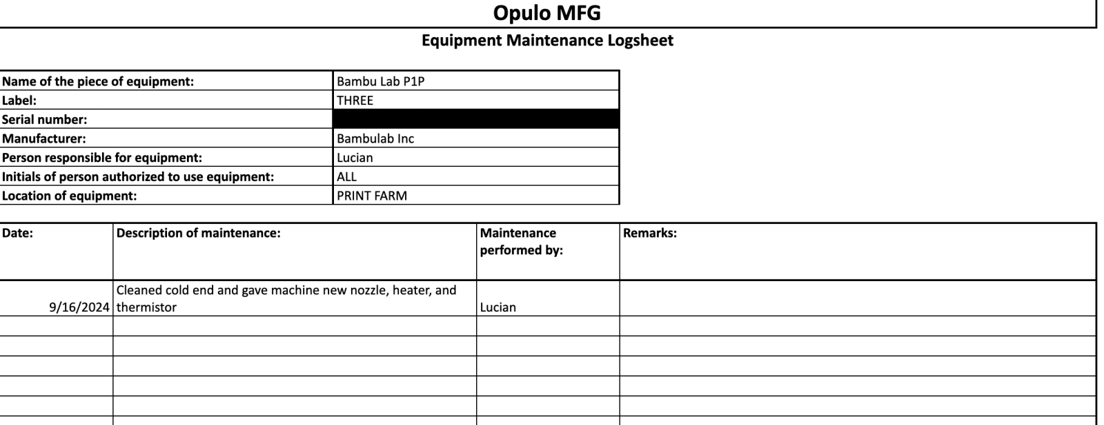 - Naviagate to Google Shared drives/OpuloEngineering/Manufacturing/In-House Production/3D Printing/Print Farm Service Log Sheets and make a copy of