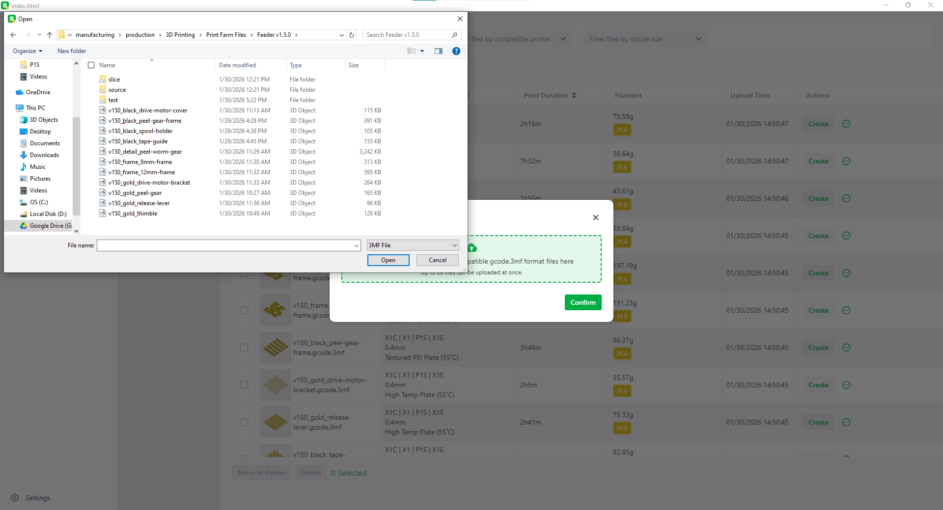 We use a utility to upload all sliced files to our print farm. Open FarmUpload on your computer, select the settings.json file in the "Print Farm Files" Drive folder, and select the newly filled slice folder.