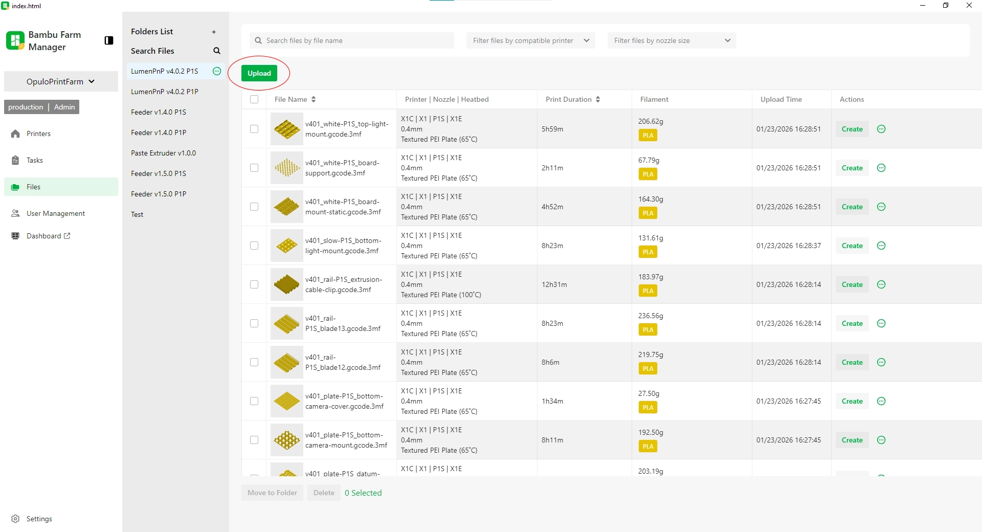 Files should be uploaded to Google Drive following the guidelines laid out by the Google Drive section. Files will then be uploaded from Google Drive to the Bambu Farm Manager software manually. If there is an update to a file added to Google Drive, the file inside Bambu Farm Manager will not automatically update. The updated file must be re-uploaded into the Bambu Farm Manager.