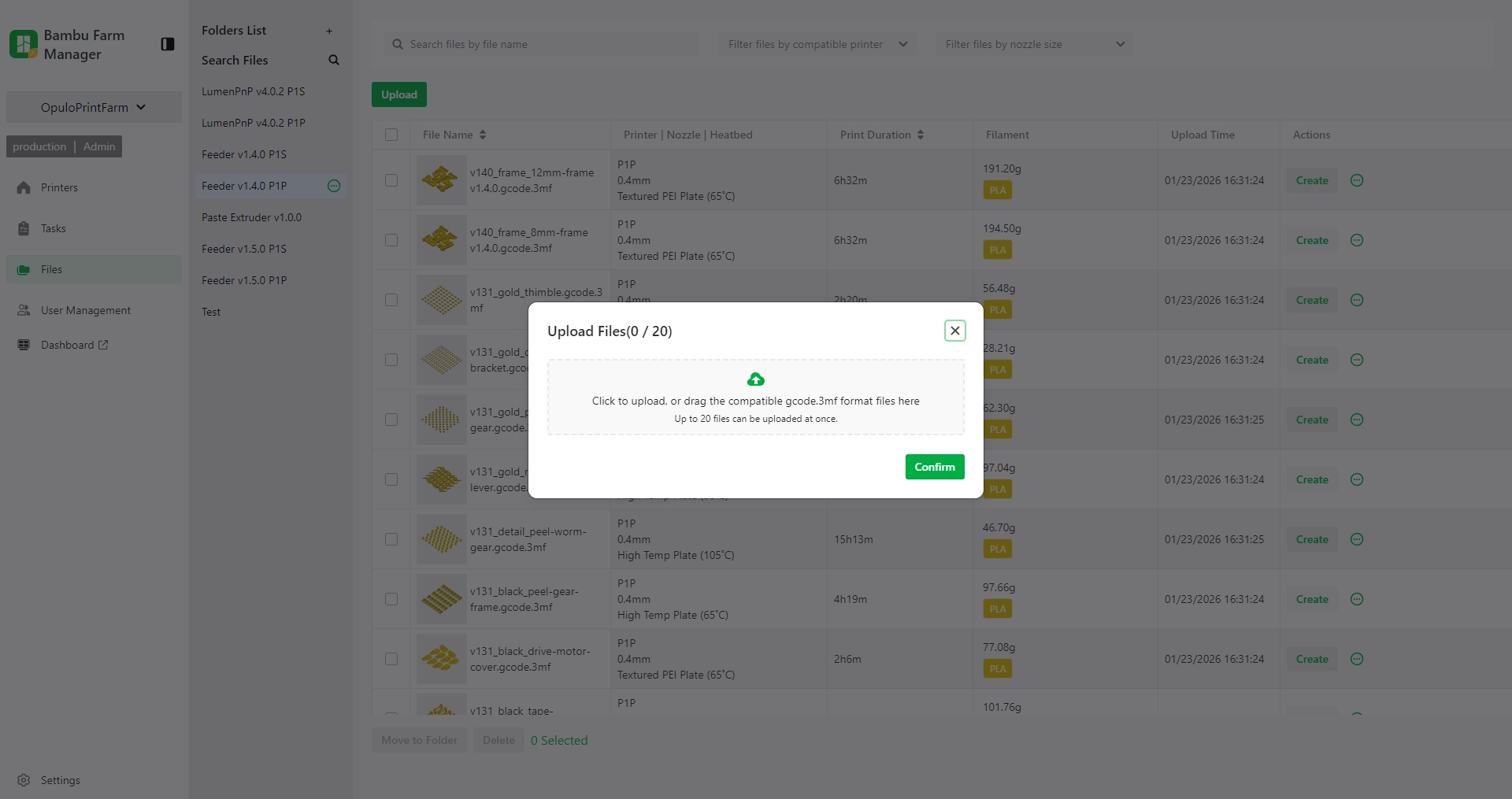 If there is a new version of the file you'd like to print, you need to upload the new version in "Files". Please follow along with the Uploading Files section for clear instructions on how to upload files to the Print Farm Manager software.