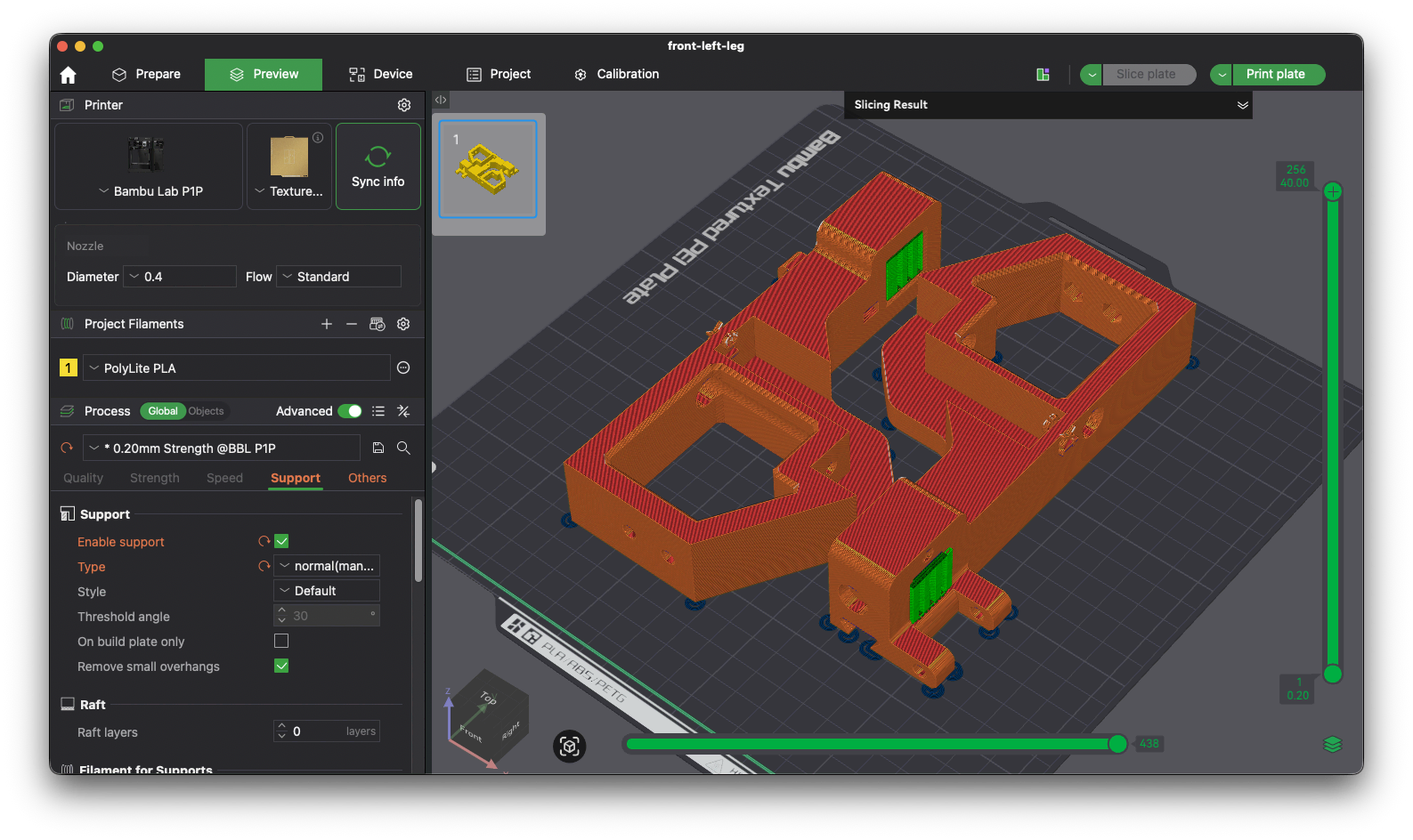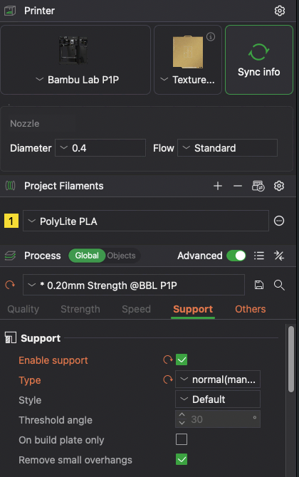 Once the bed is properly arranged and support is added, save the file and prep for slicing. Pick either the P1P printer or the P1S printer. We will need to slice twice for each printer. Set the filament to PolyLite PLA and use the 0.20mm Strength preset. Then, select the proper bed for this print. Check the Kanban Cards to see which bed this should be printed on. Also double check that support is enabled, as it is off by default and may switch back to off if you change the preset.