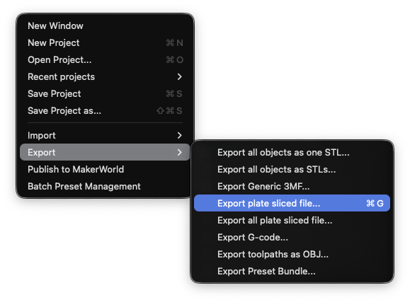 Once all looks good, we will export the sliced plate to upload onto the farm computer. File > Export > Export plate sliced file or ⌘ + G to export. Save to Shared drives > OpuloEngineering > manufacturing > production > 3D Printing > Print Farm Files. Since we are exporting a P1P file here, we would save this example in LumenPnP v4.1.0 > slice > P1P.