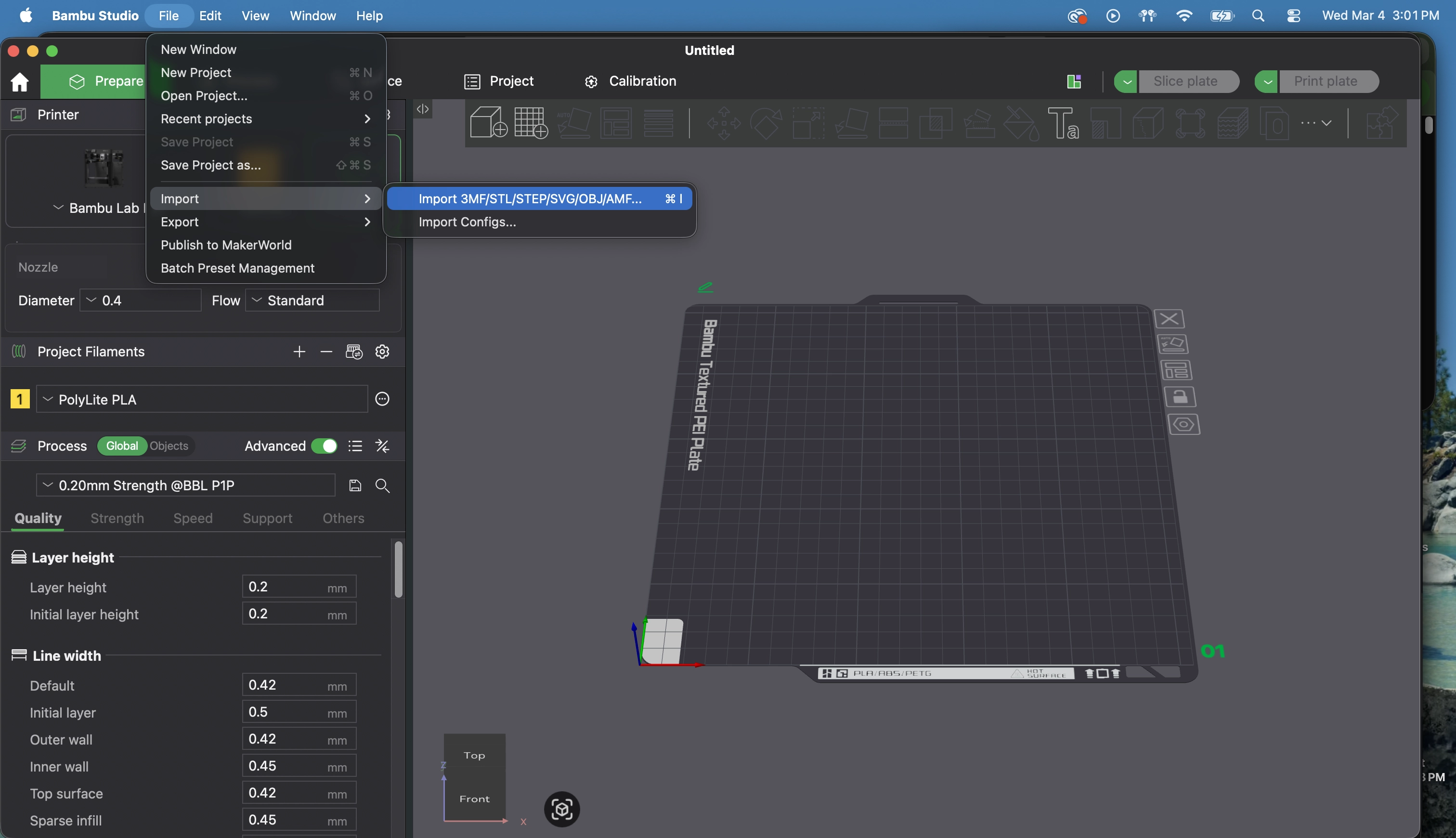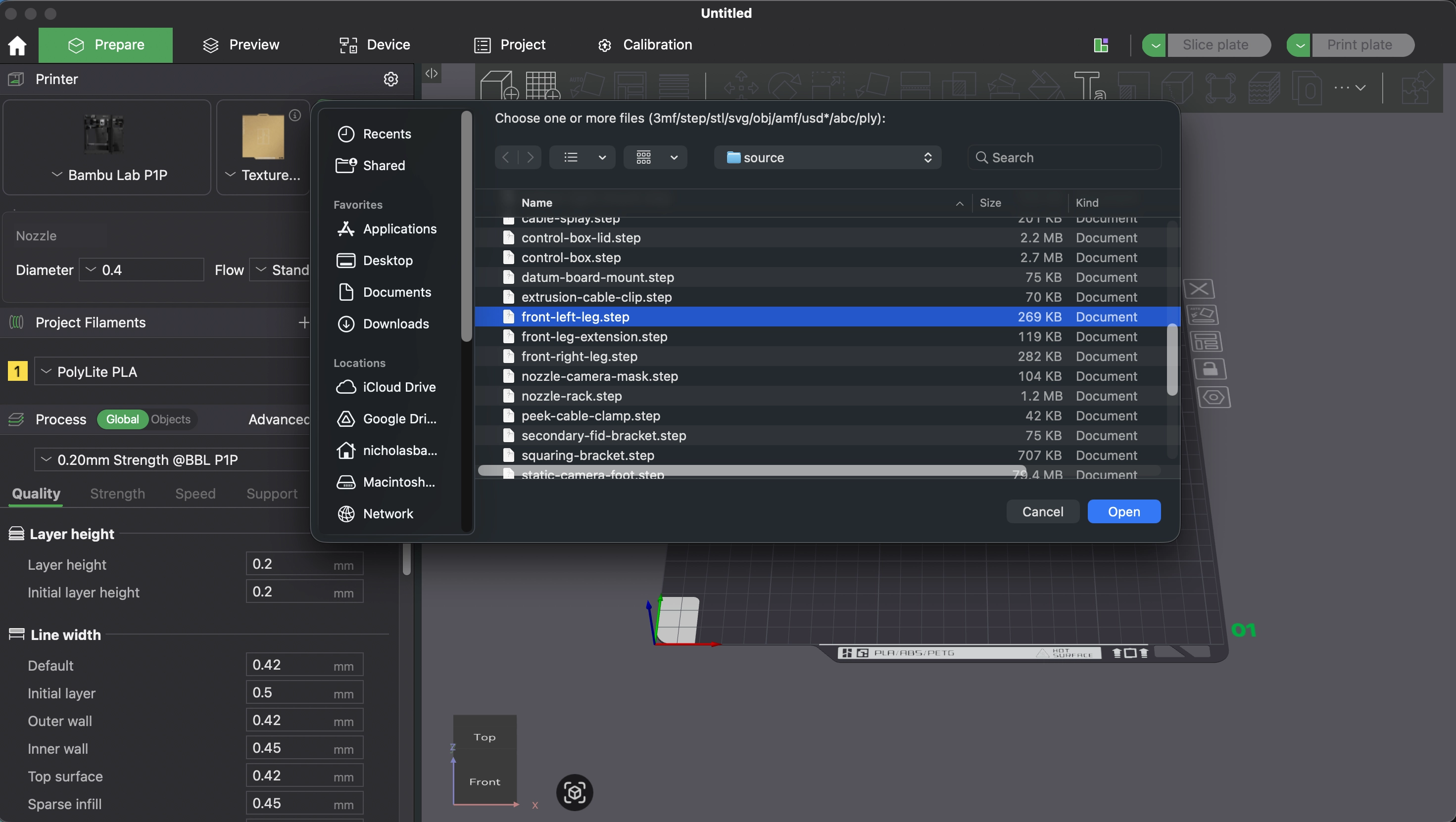 Get new source files for the new release from the engineering team. Open a new Bambu Studio file and import the .step file by going to File > Import > Import 3MF/STL/STEP/OBJ/AMF... or use the ⌘ + I keyboard shortcut.
