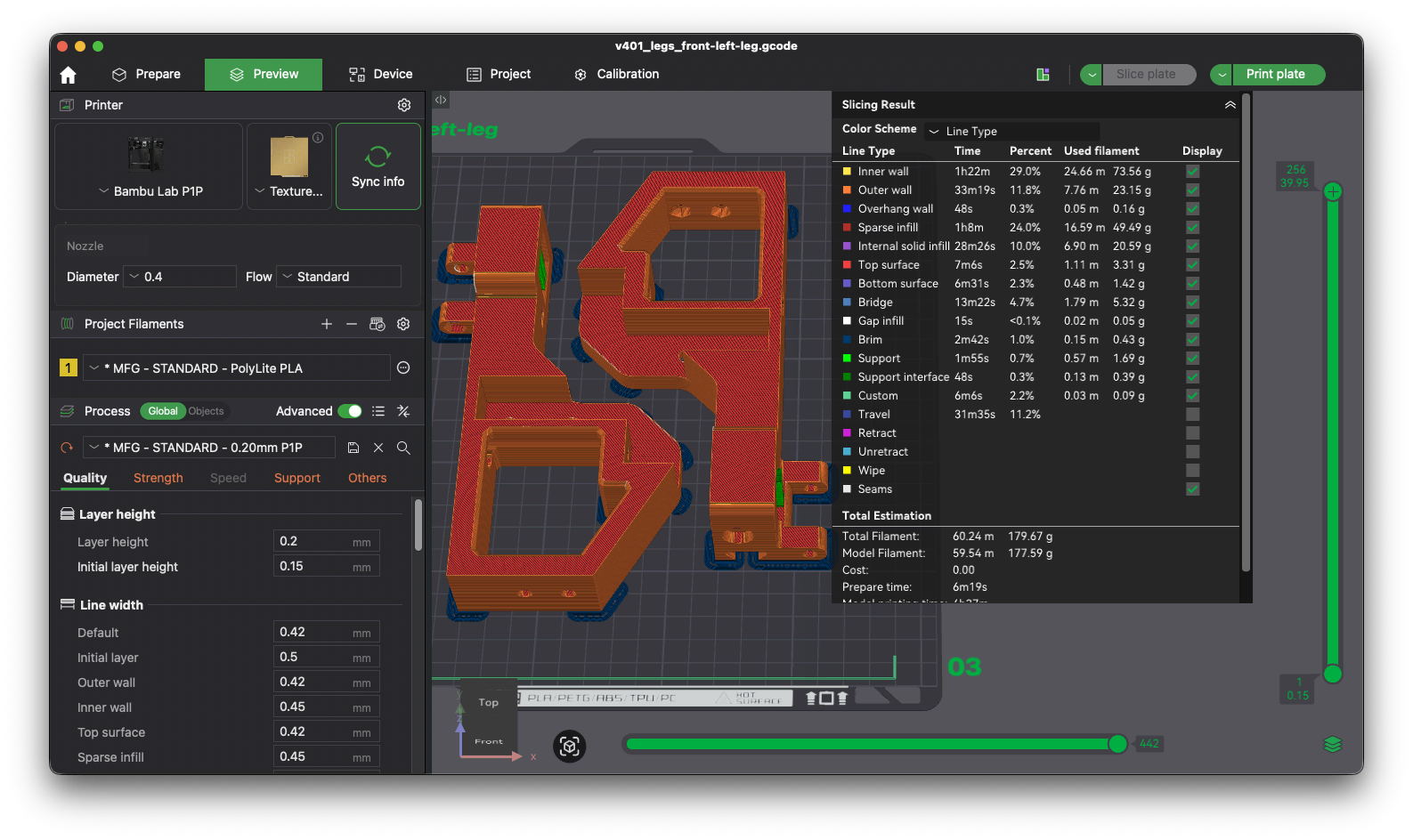 After opening the file, check to see if this print needs support. Change the color scheme to Line Type in the Slicing Result window. This will allow you to easily see existing support.