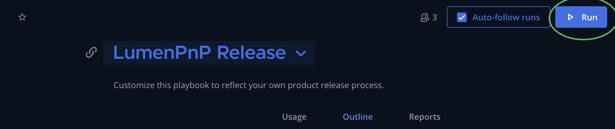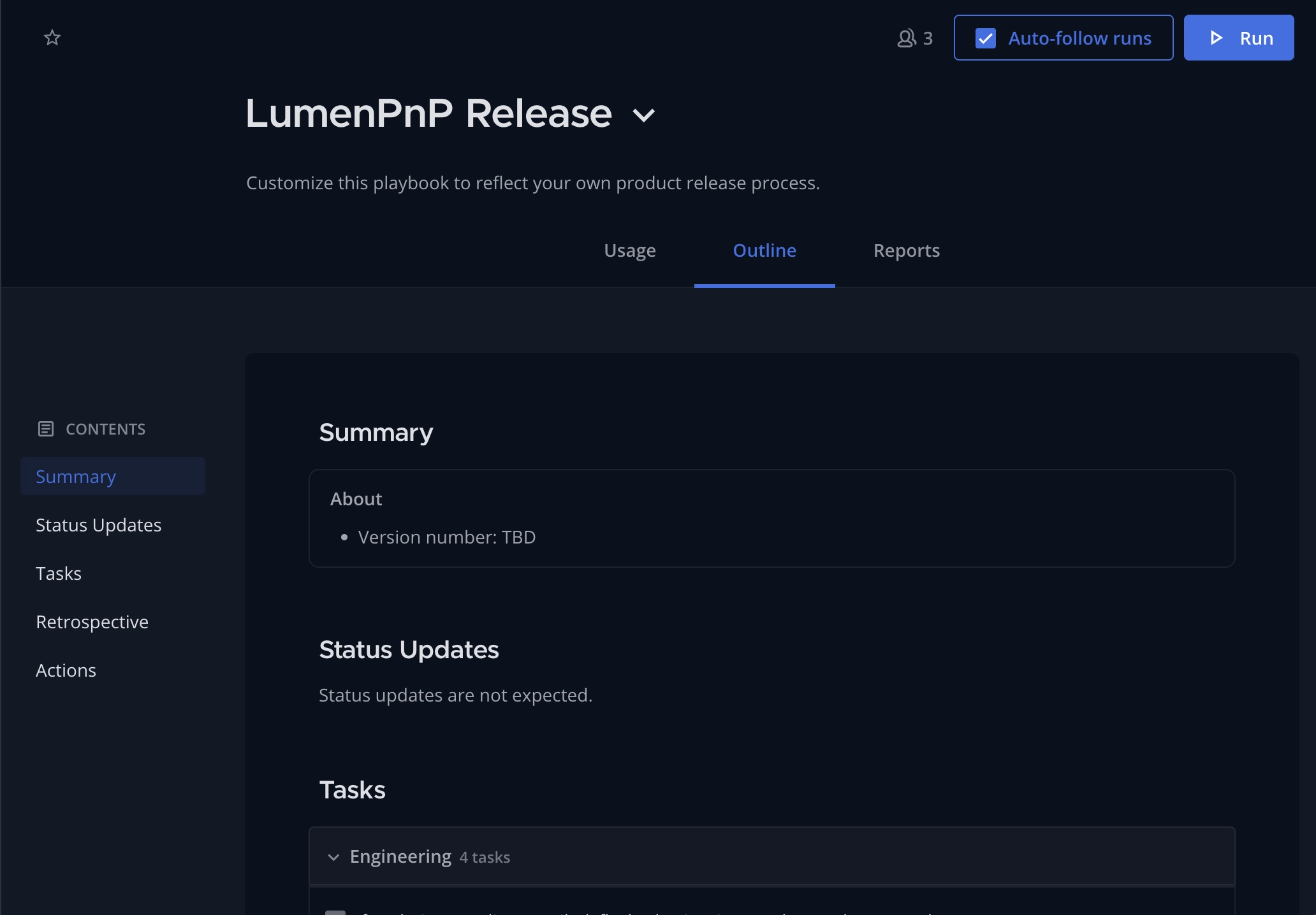 After opening the Playbook, navigate to the Outline page. Ensure all tasks listed are still relevant and necessary for release. Once the information is verified, you can run the Playbook. Click Run at the top right of the page.