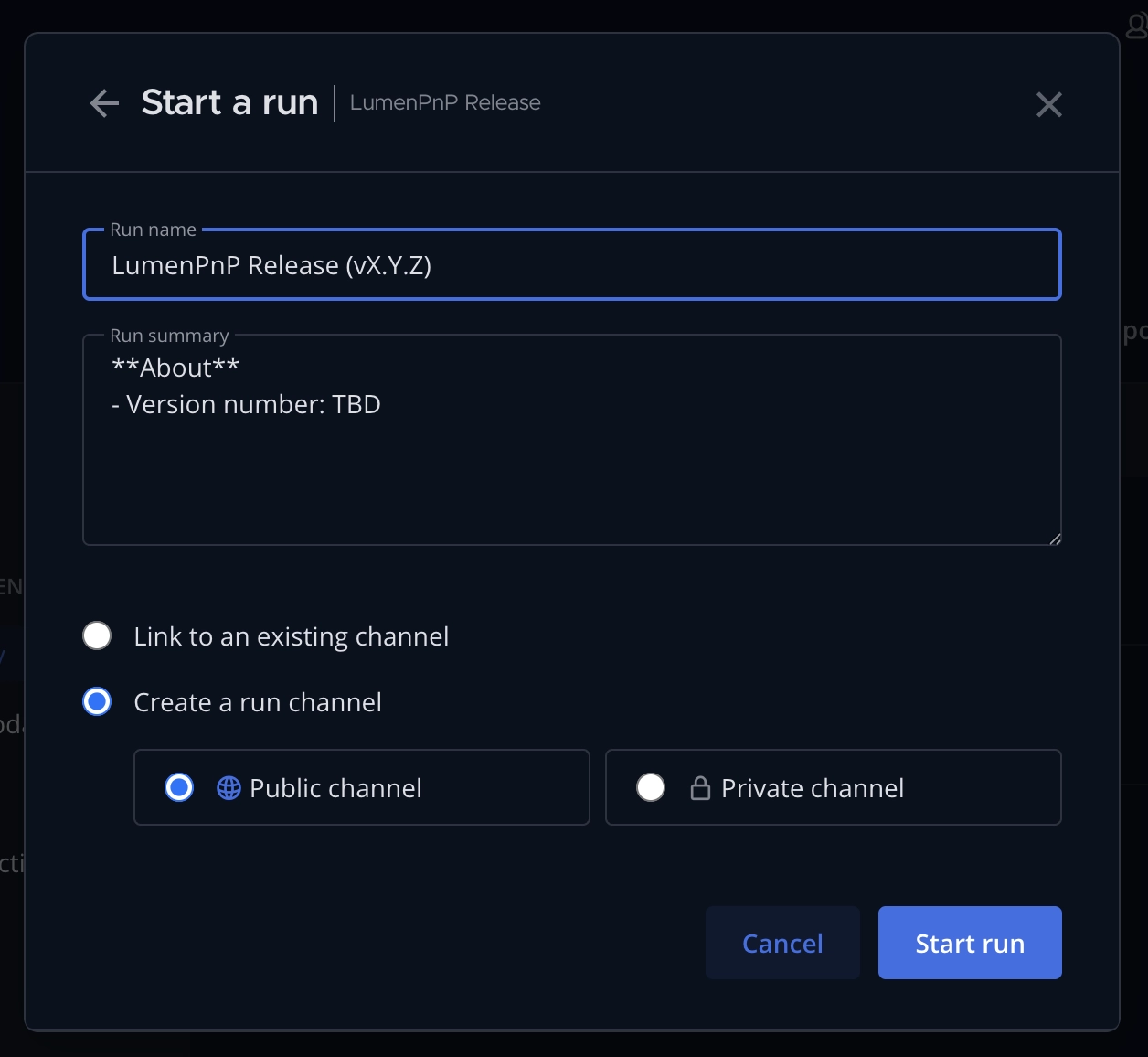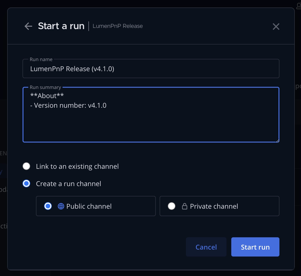 Decide if you want to create a public or private channel that will be linked with the release. Once you've made your selection, click Start run at the bottom right of the window.