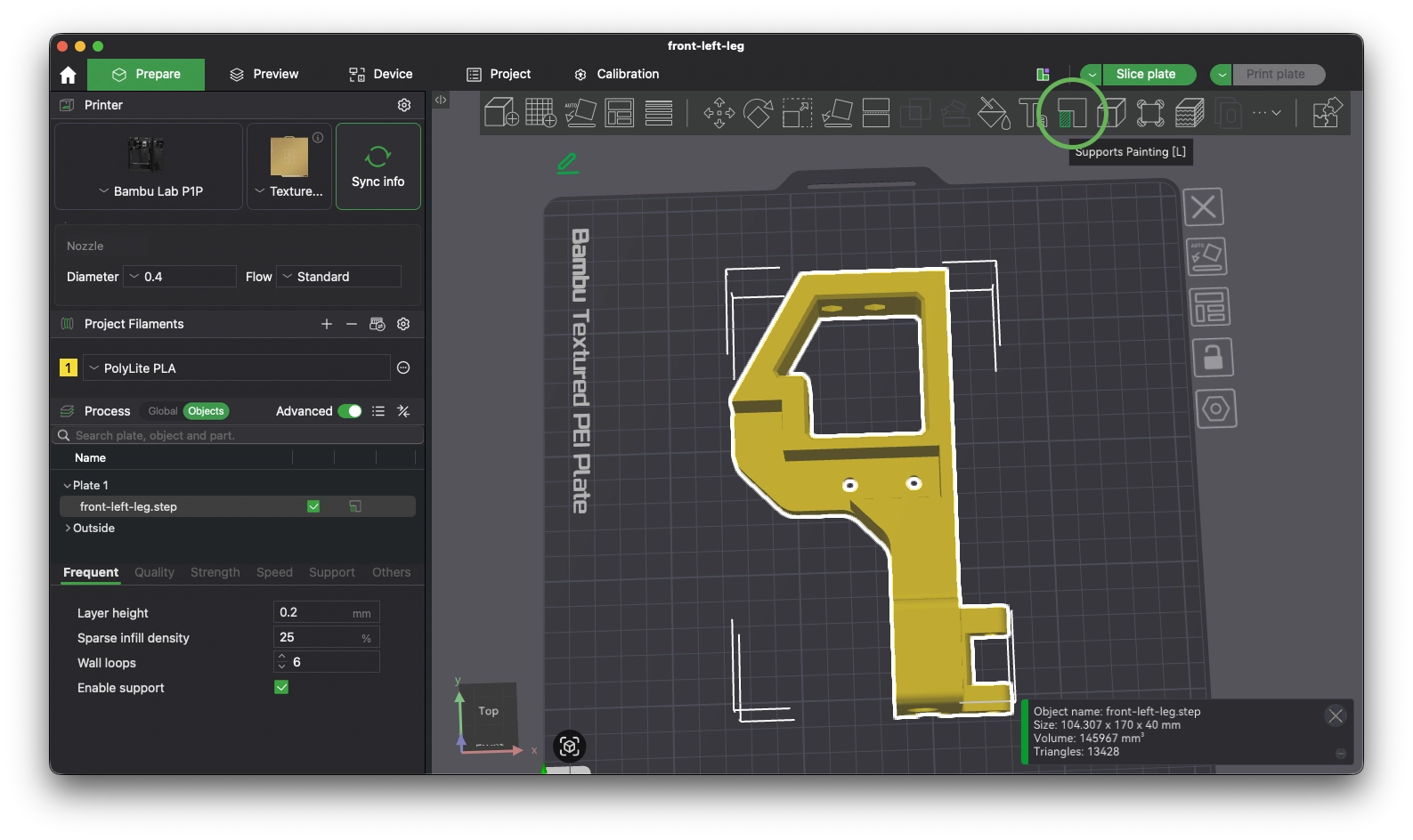 Here we can see that there is support in the open cavity of the part (indicated in green) and there are brim ears around the print to help with bed adhesion (indicated in blue). We want to mirror the support shown here onto our new version file. Click the object and then click Supports Painting in the menu (or use the keyboard shortcut L).