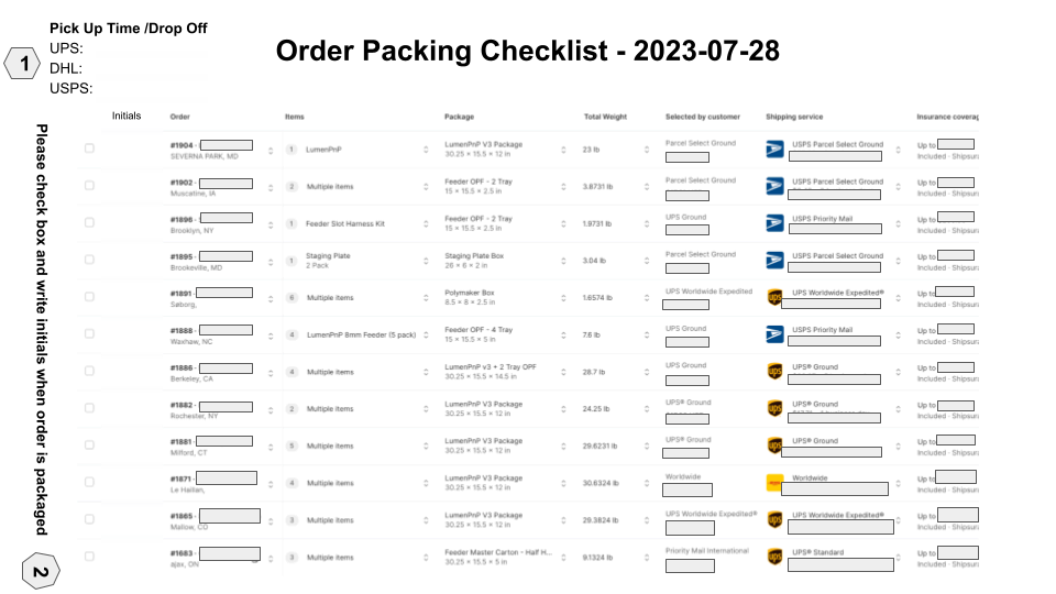 order-packing-checklistis checked-off and initialed - No unused shipping labels are left sitting out