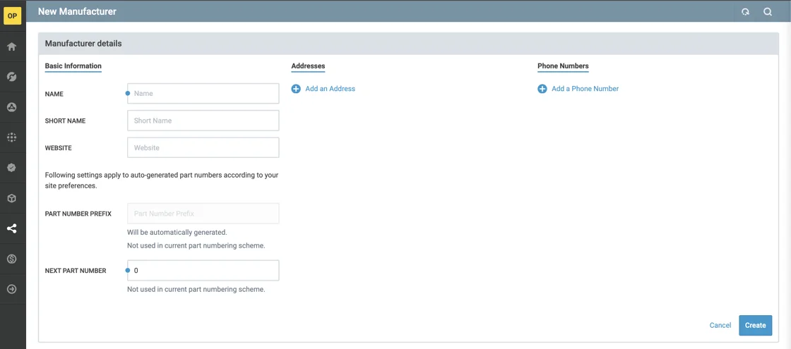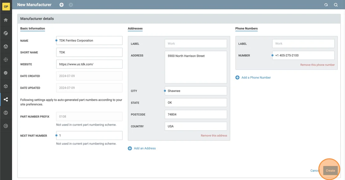 Once all information has been entered, click "Create" in the bottom right section of the screen to create the manufacturer