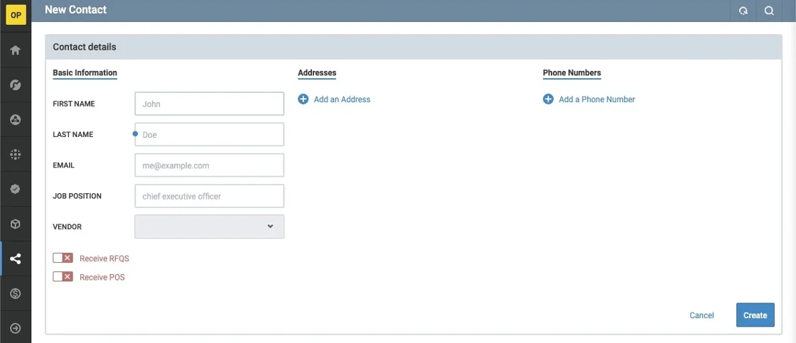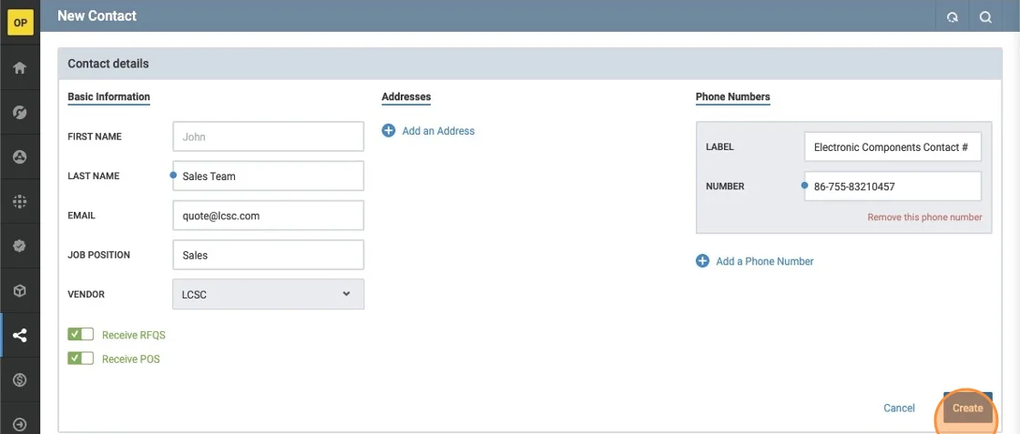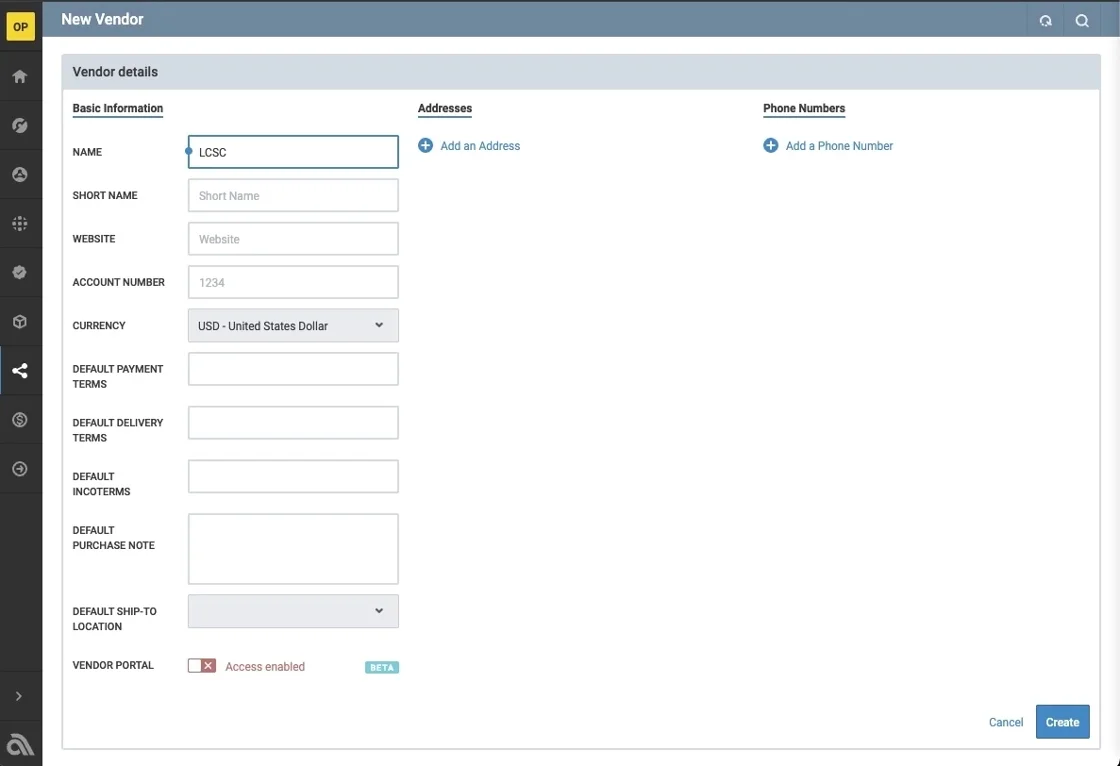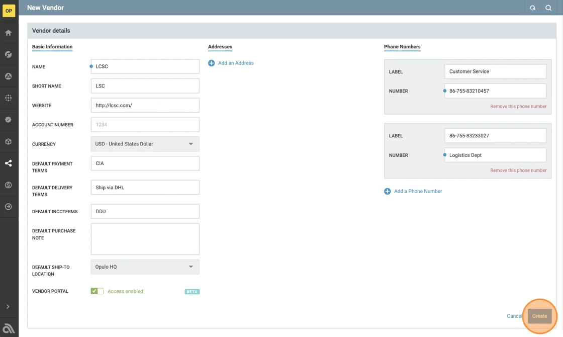 Once all information has been entered, click "Create" in the bottom right section of the screen to create the Vendor