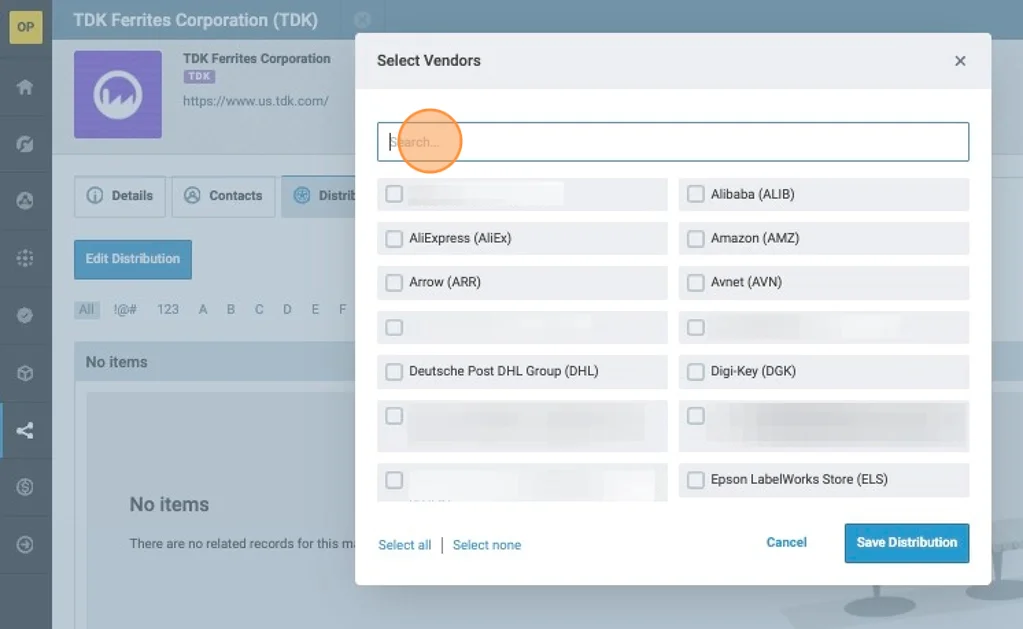 Use the "Search..." field to select each vendor the manufacturer should be associated with