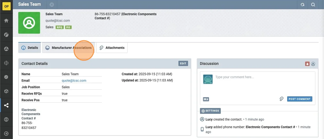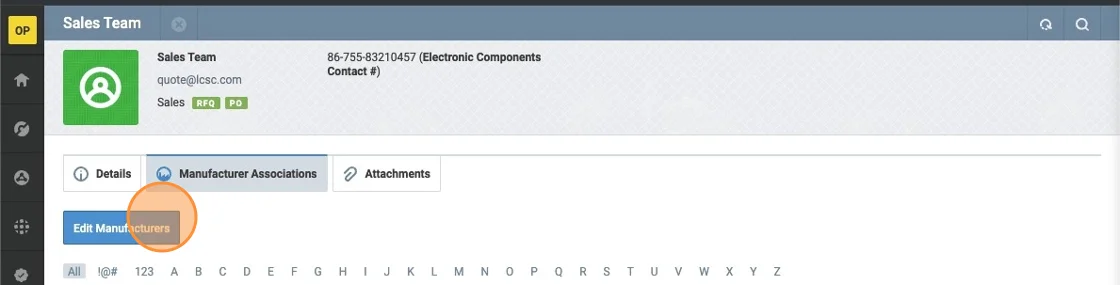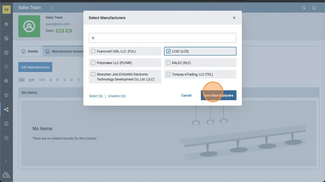 Navigate to the "Manufacturer Associations" tab on the newly created Contact listing