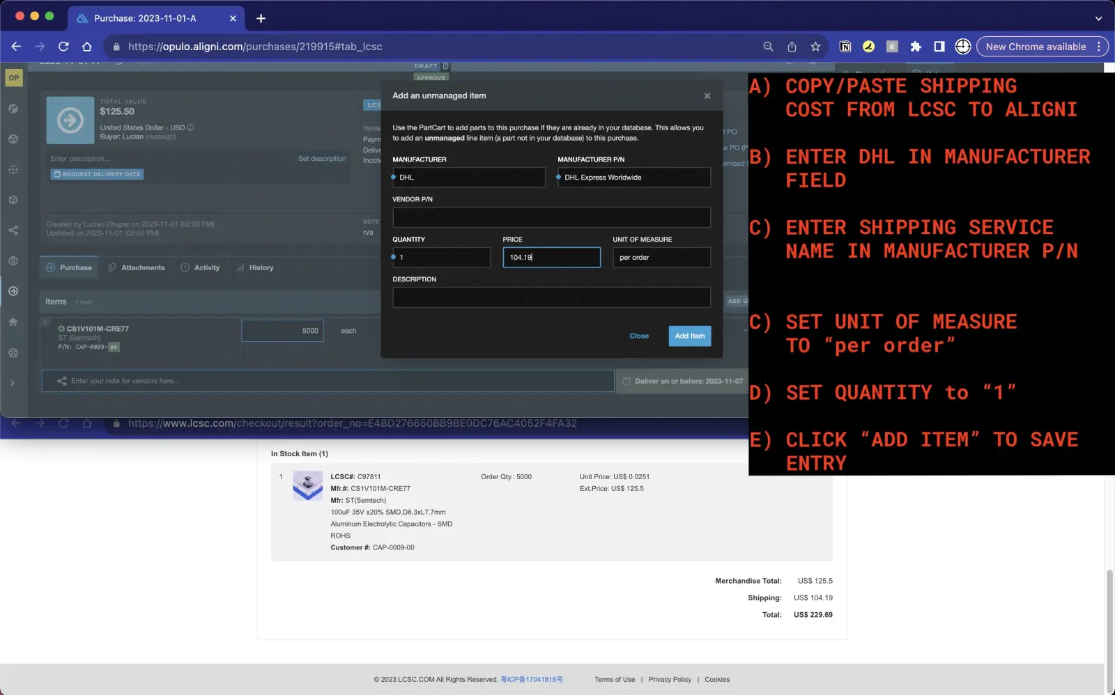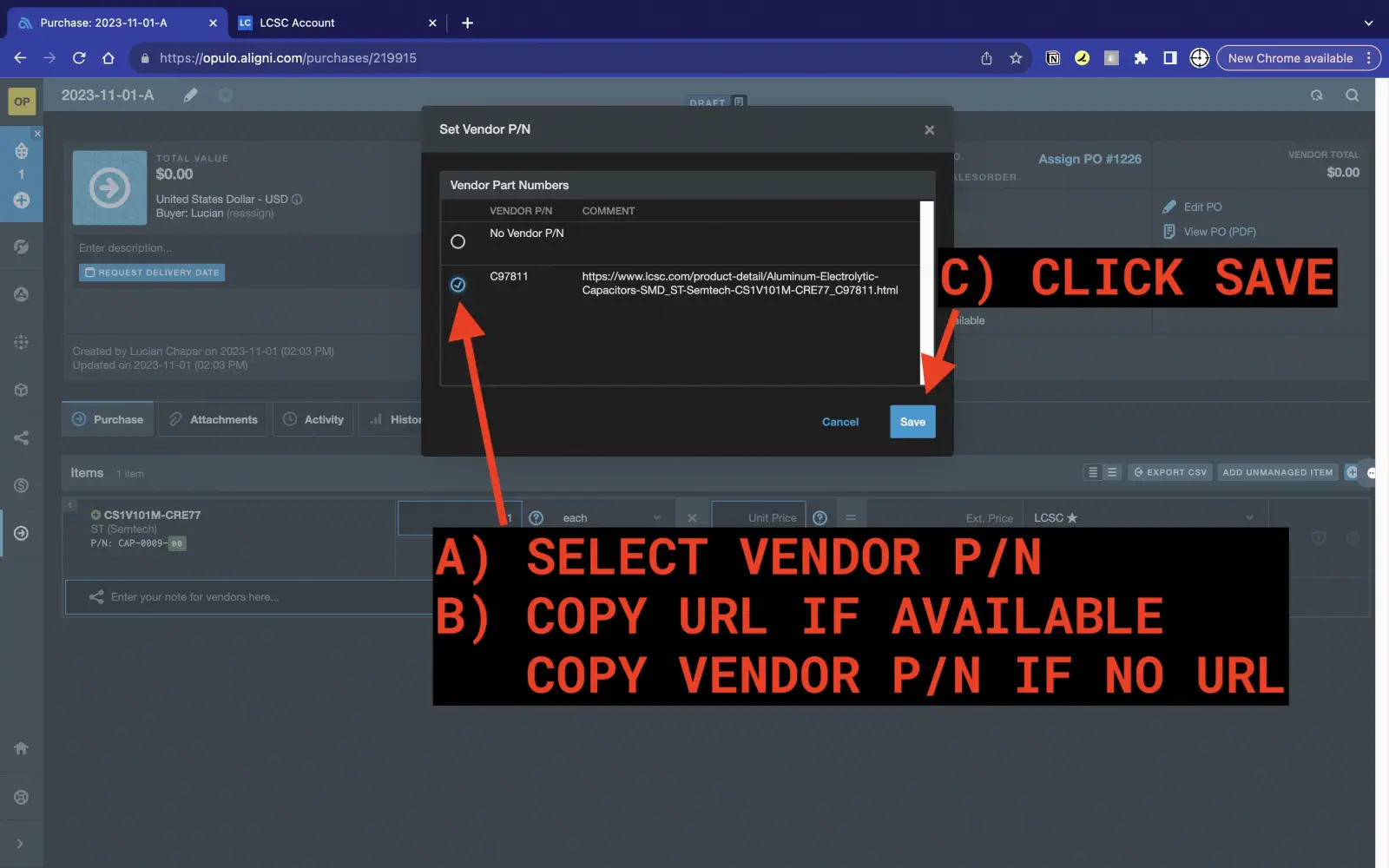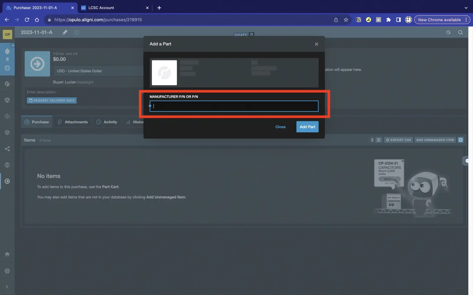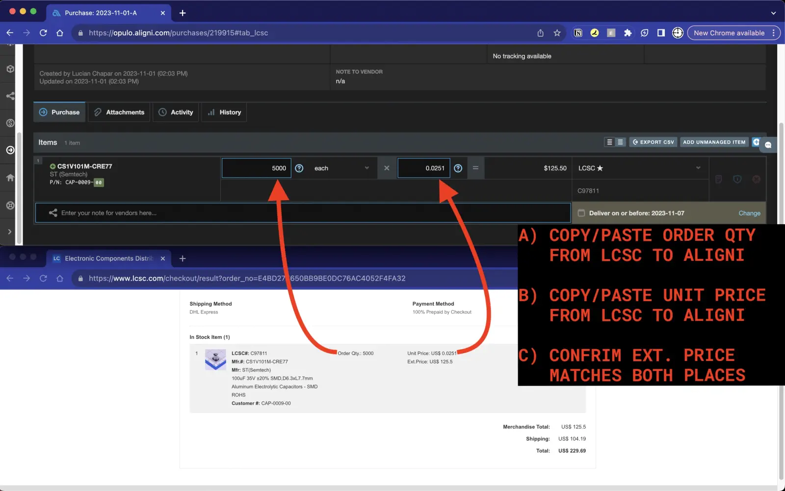 order QTYfrom LCSC to the part'spurchase QTYfield in Aligni - Copy/paste the chosen