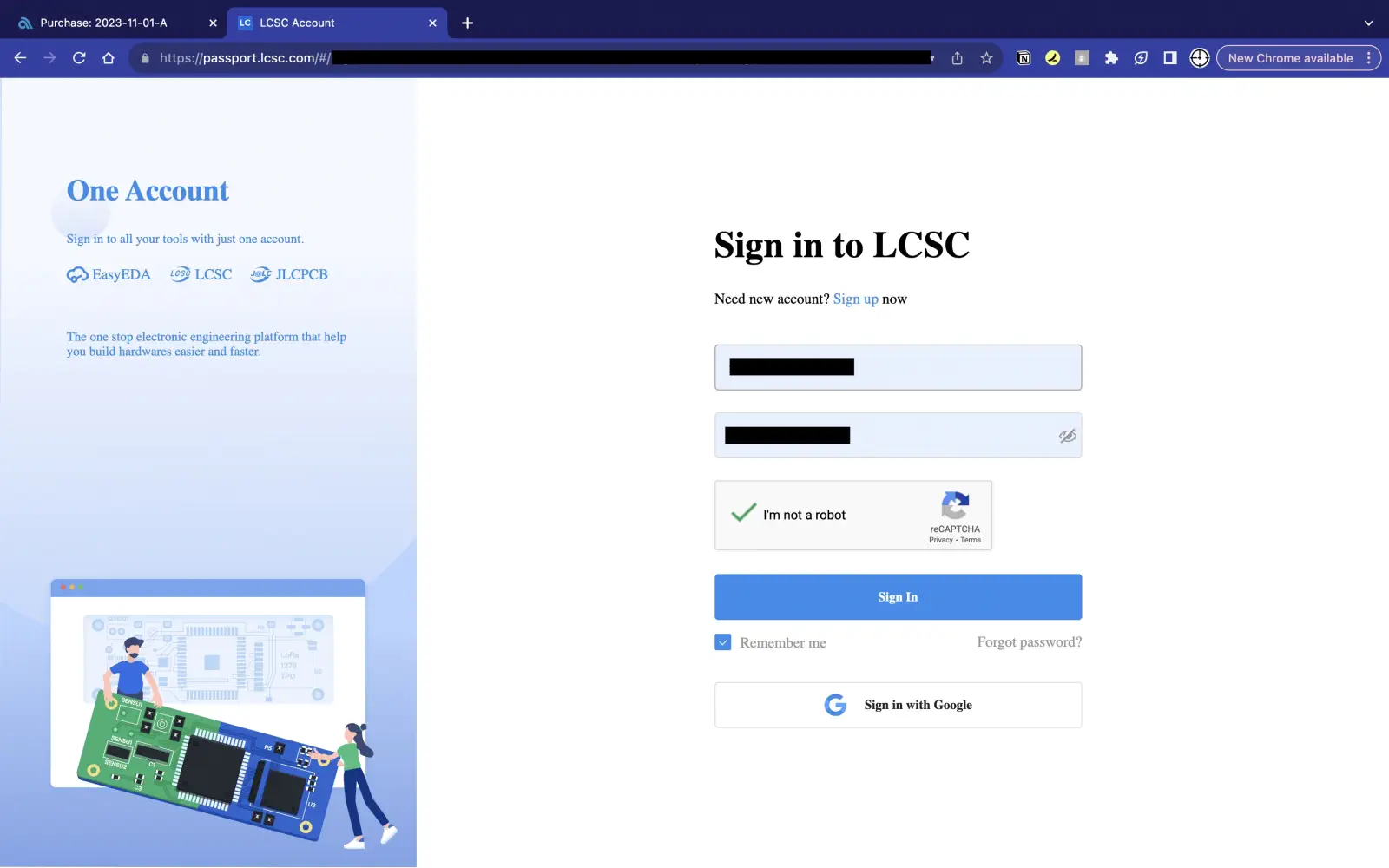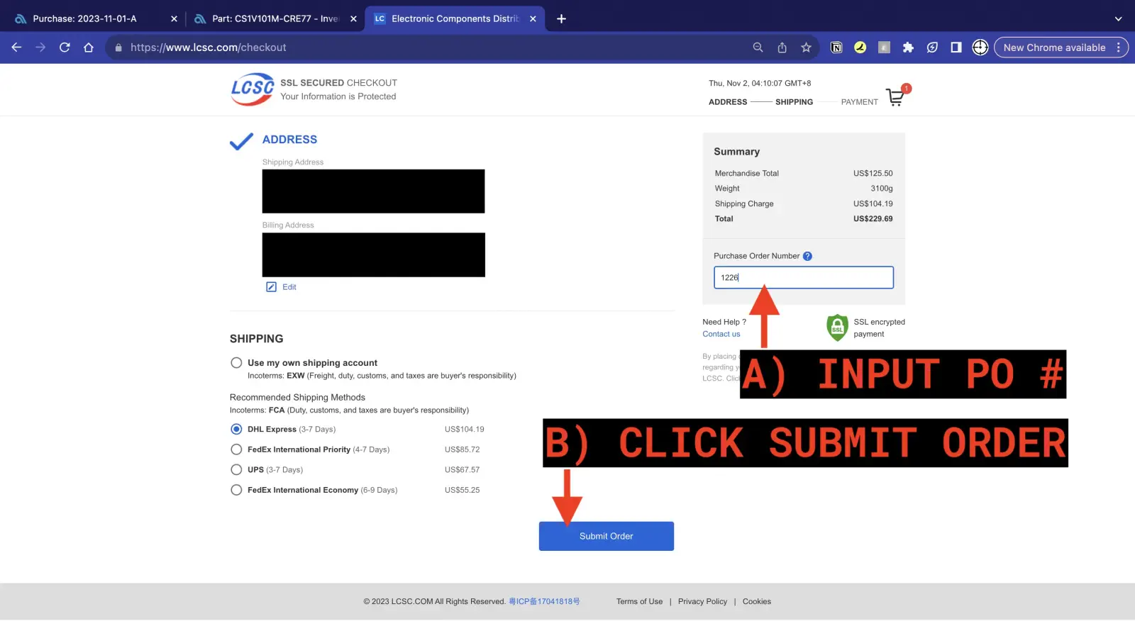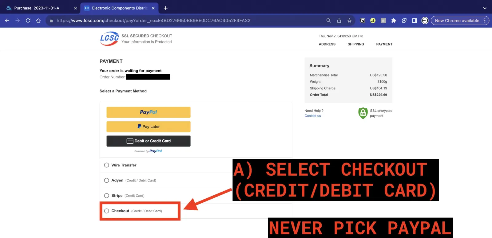 Do not continue with the checkout process on LCSC until the purchase order has been approved