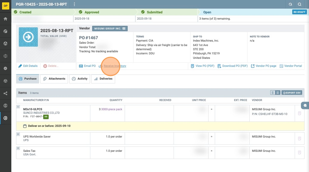 - Once the recieved amount matches the order quantity, the line item closes and cannot be received again.