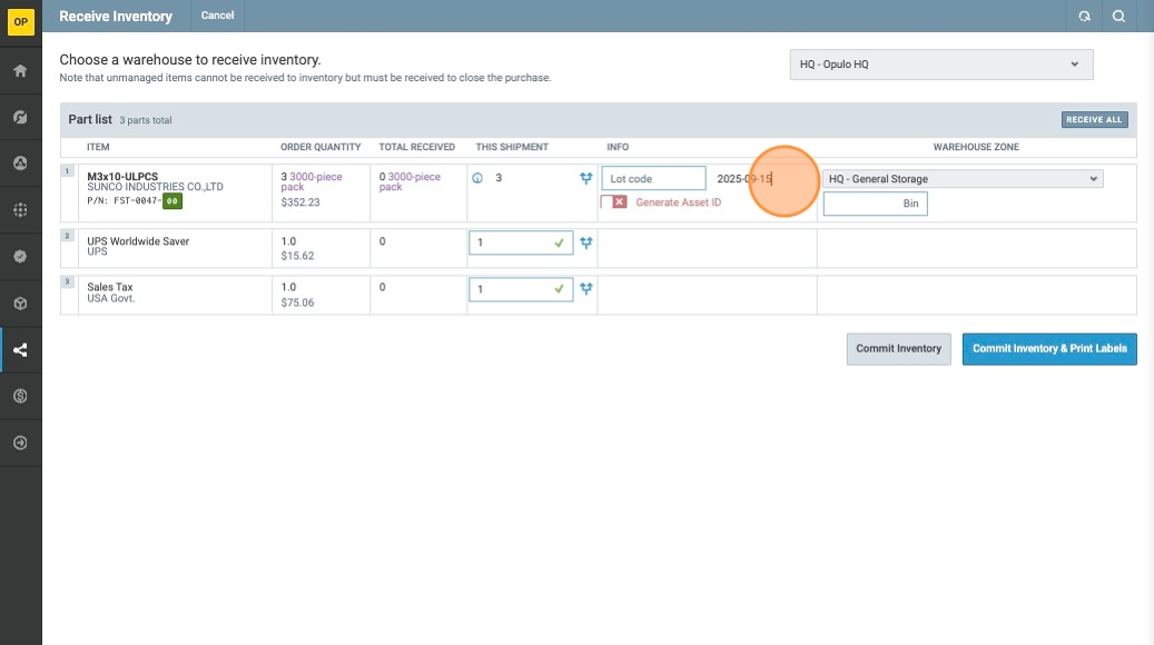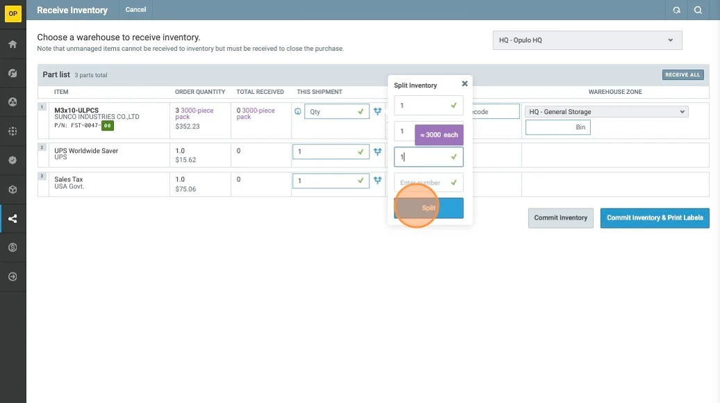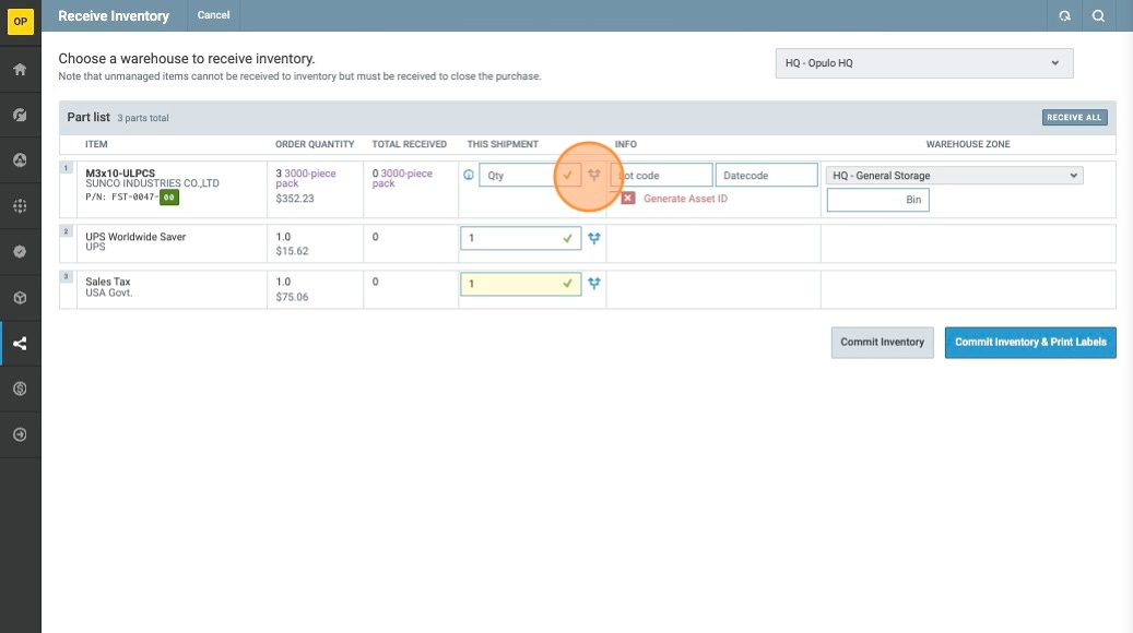 The steps below assume a line item from the PO was delivered in multiple packages. If this is not the case, you simply type the line item's
