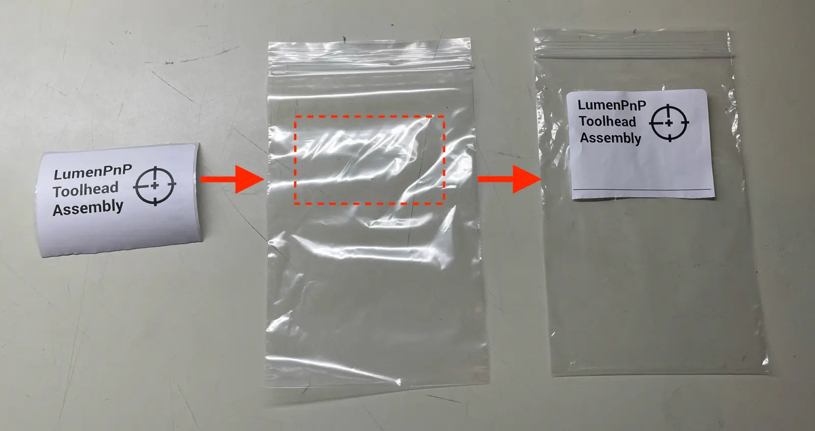 Adhere 4" x 3" LumenPnP Toolhead Assembly label to a 6" x 9" Polybag as shown in the image below